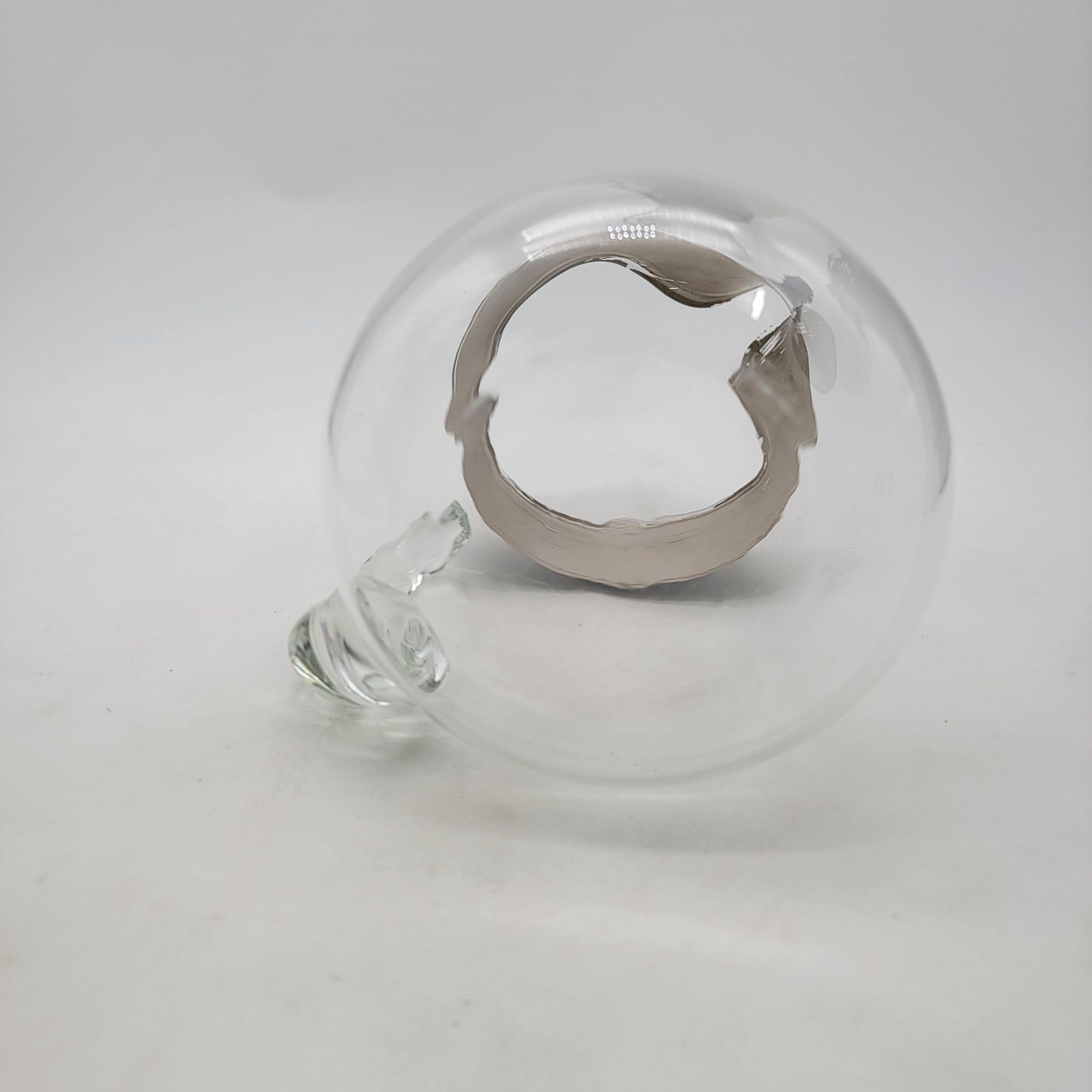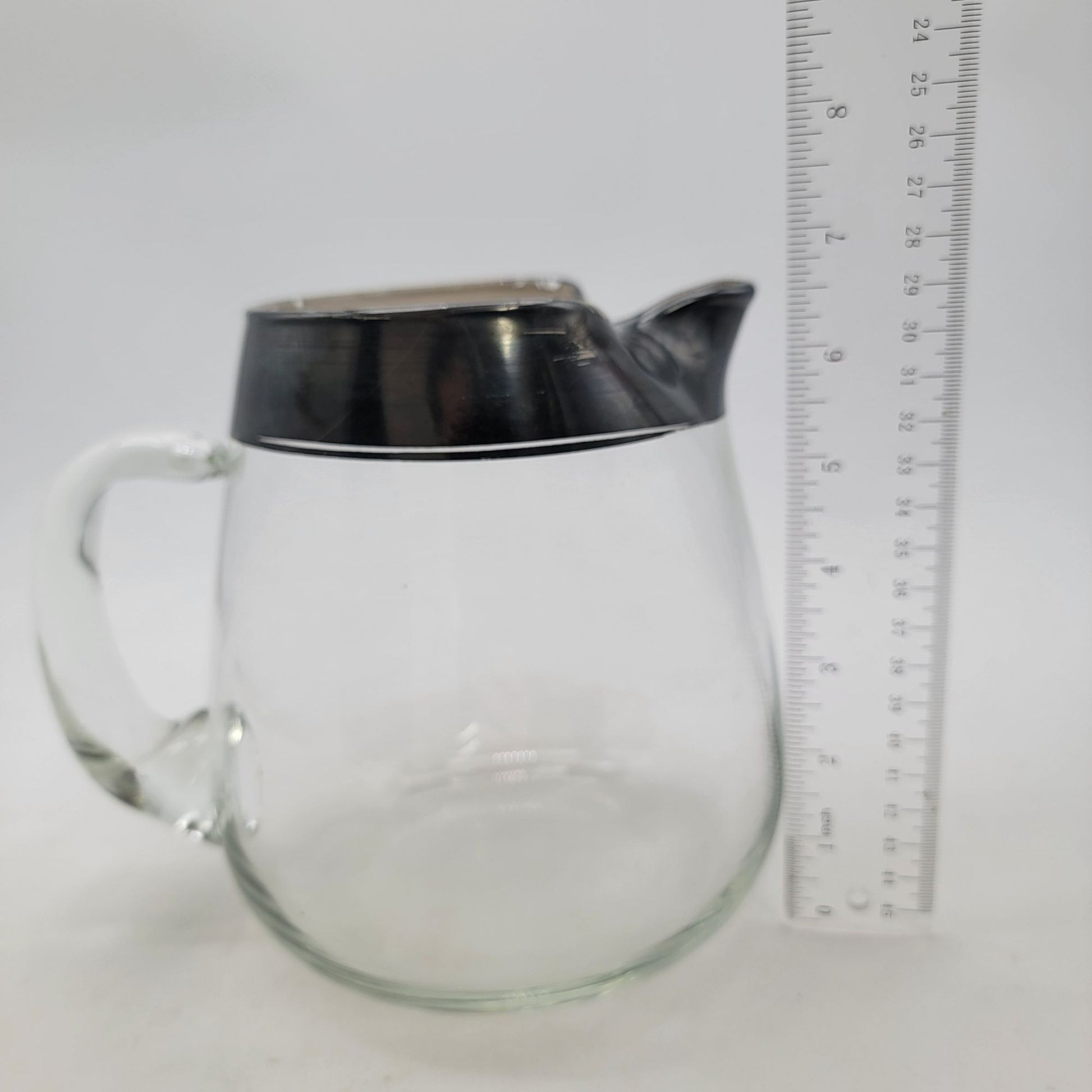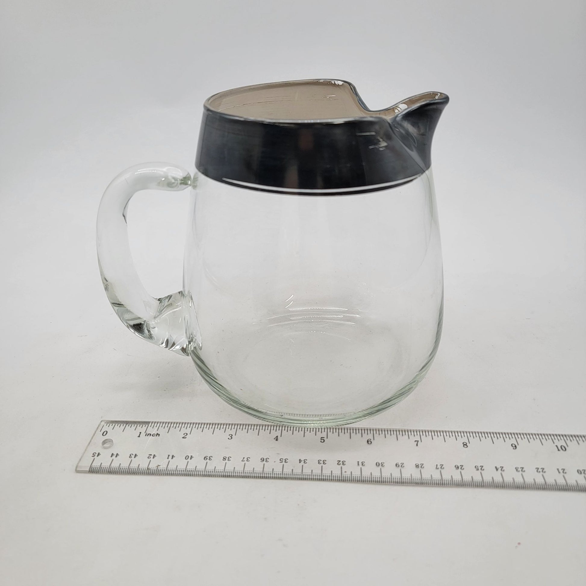 A classic mid-century modern serving piece that embodies elegant simplicity, this glass pitcher features a distinctive silver-rimmed top and graceful curved handle. Crafted with precision, the transparent glass body allows beverages to shine through while the metallic accent adds a touch of sophisticated refinement.