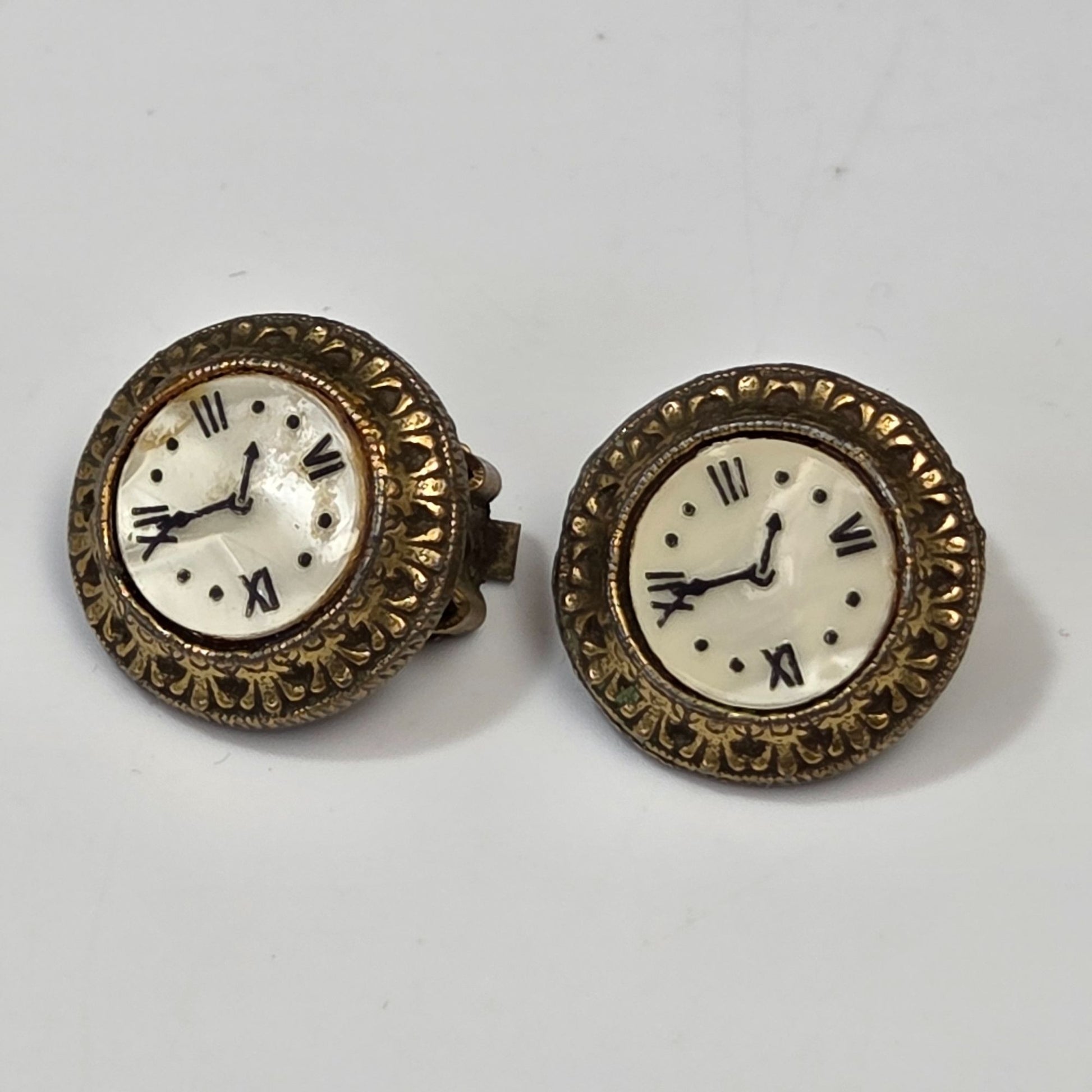 Vintage Mother of Pearl Clock Face Clip-On Earrings Signed ART