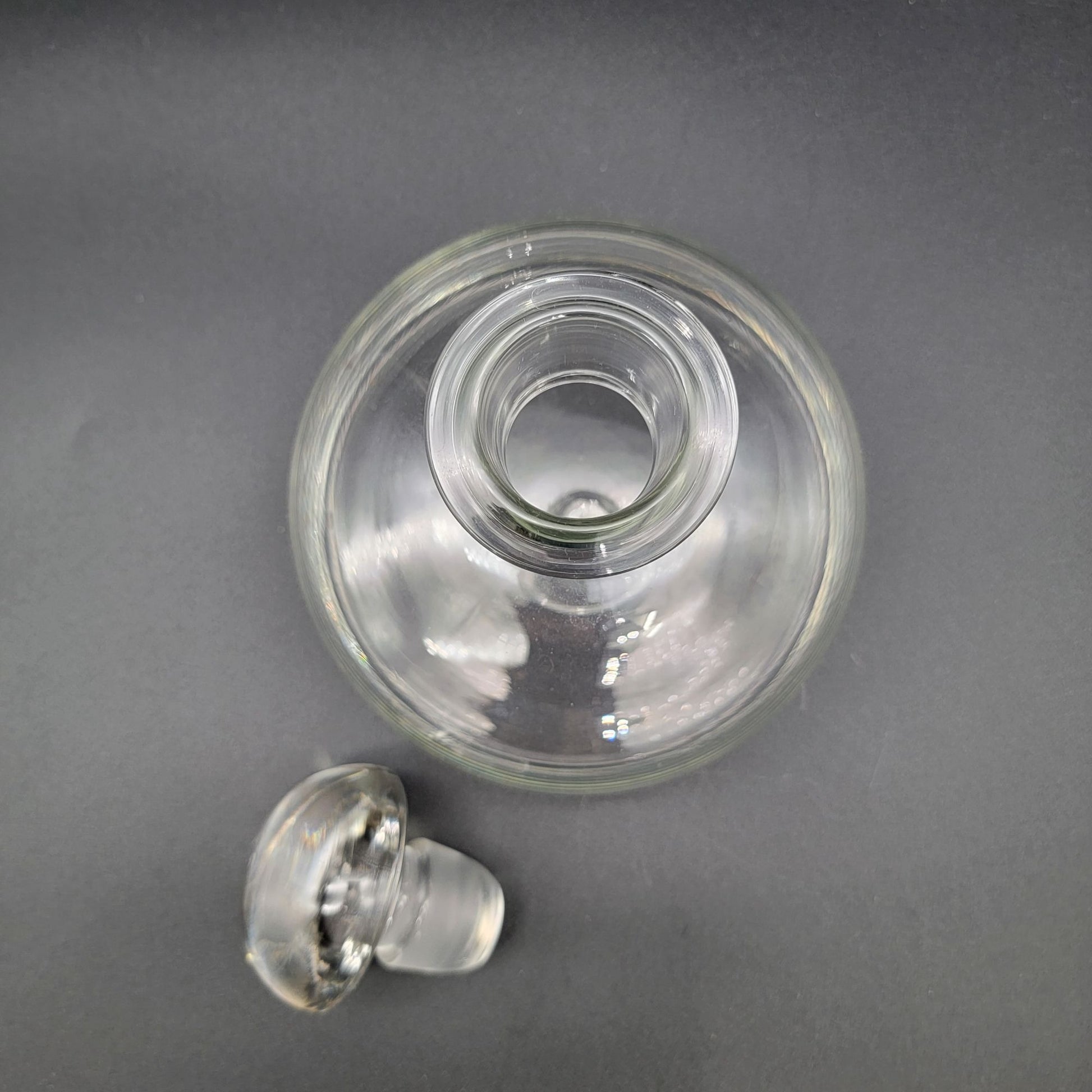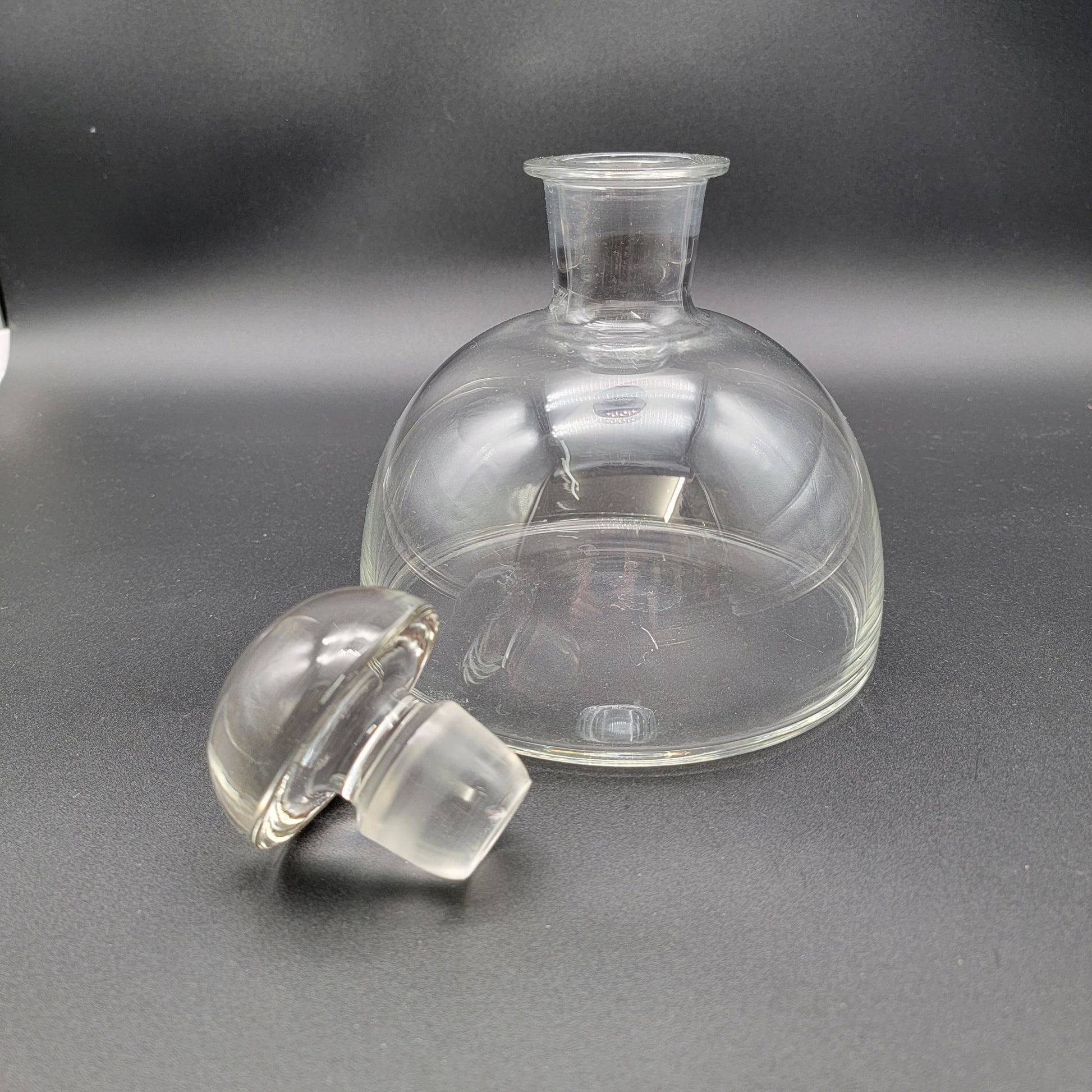 This vintage glass decanter, featuring a unique mushroom shape, showcases timeless elegance. Its clear glass design and rounded stopper make it a striking collectible or display piece.