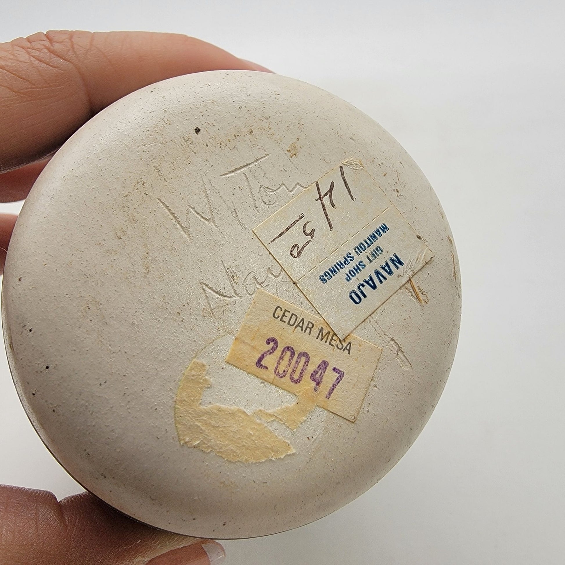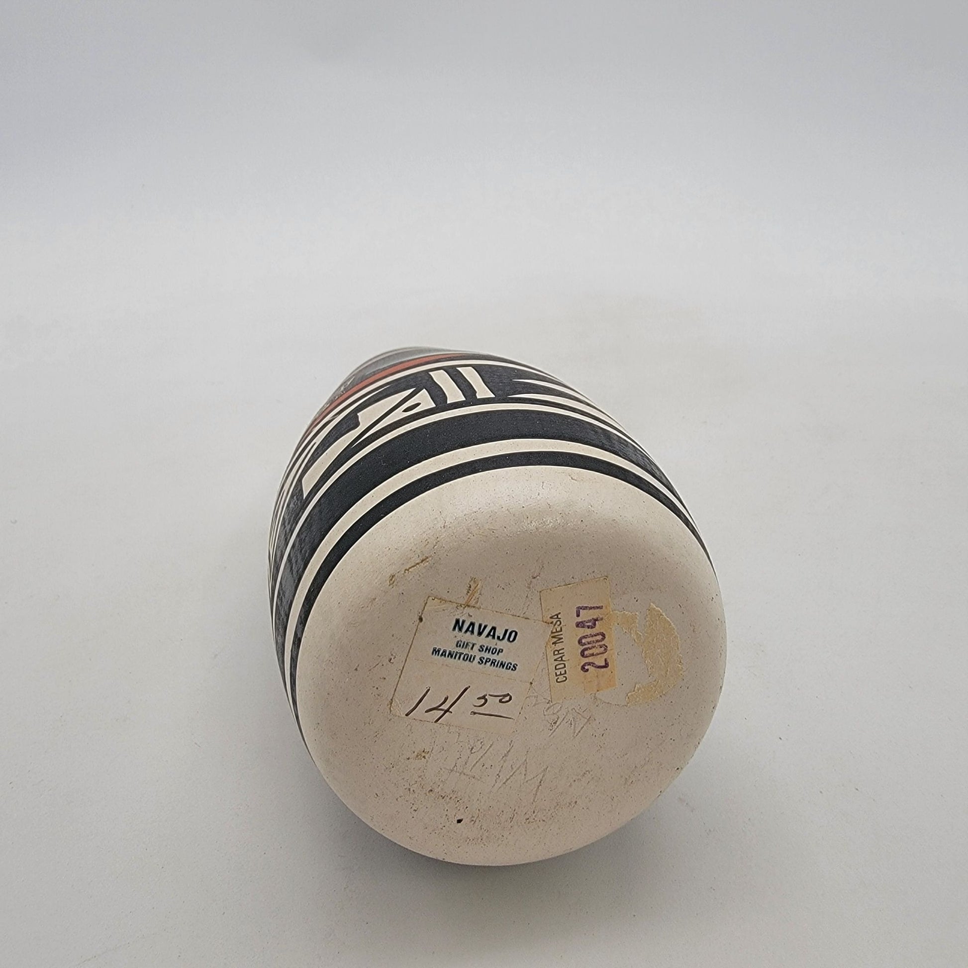 This vintage Navajo Dine pottery vase, crafted by Cedar Mesa Pueblo Pottery , features intricate etched designs. Its Southwestern aesthetic and rich history make it a cherished collector's item.