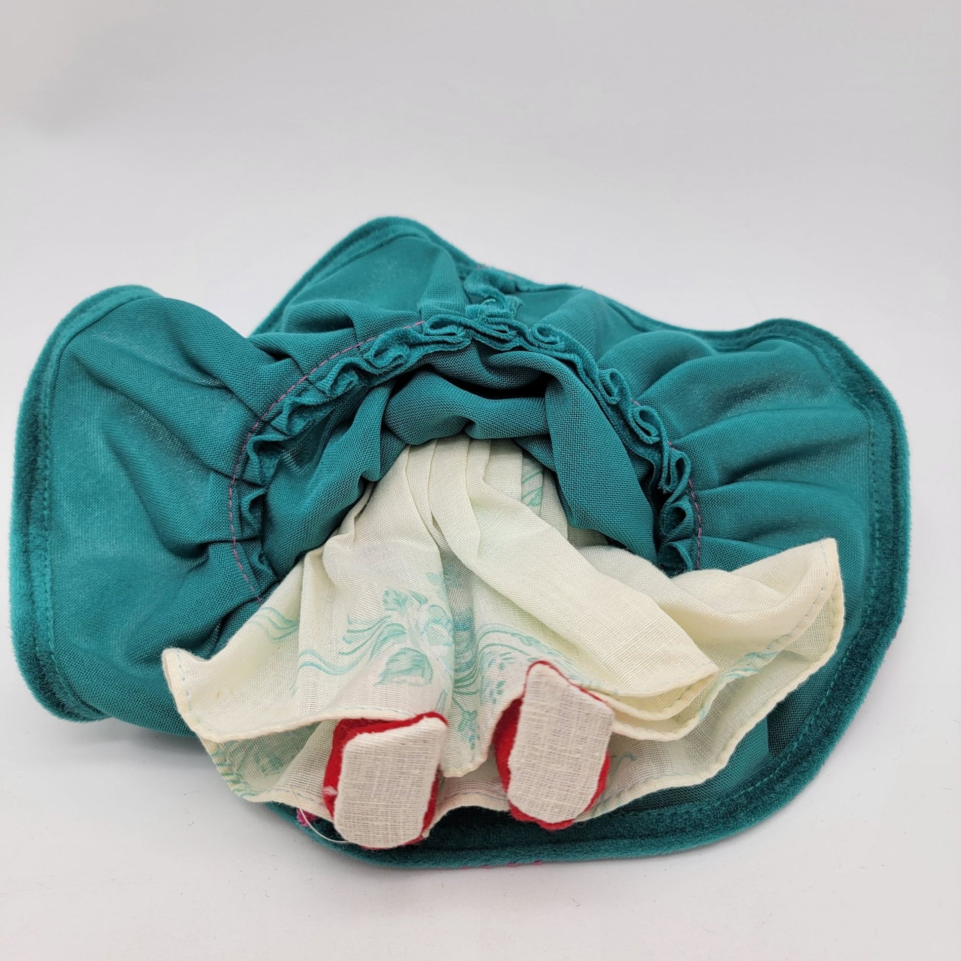 • Teal velvet dress with pink trim