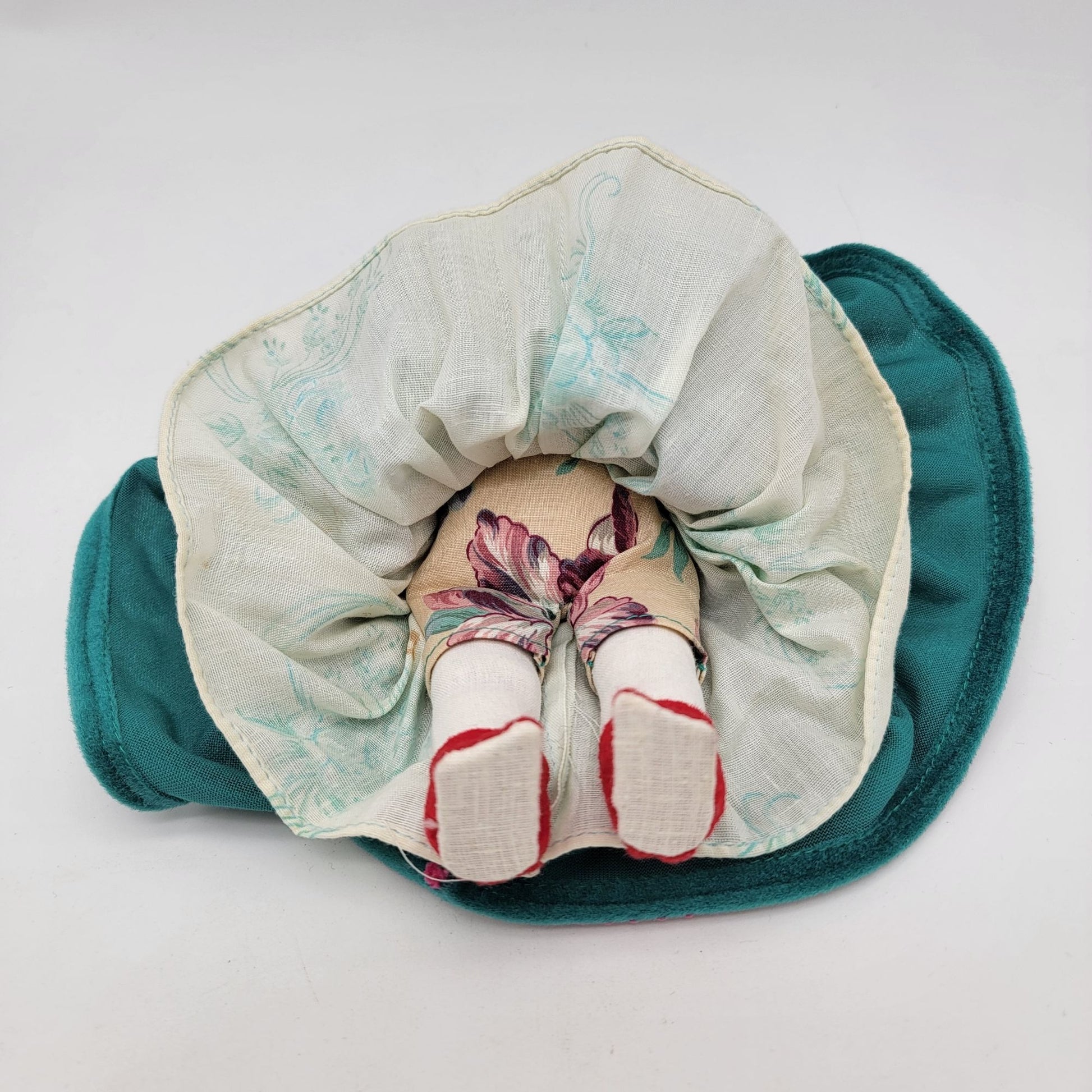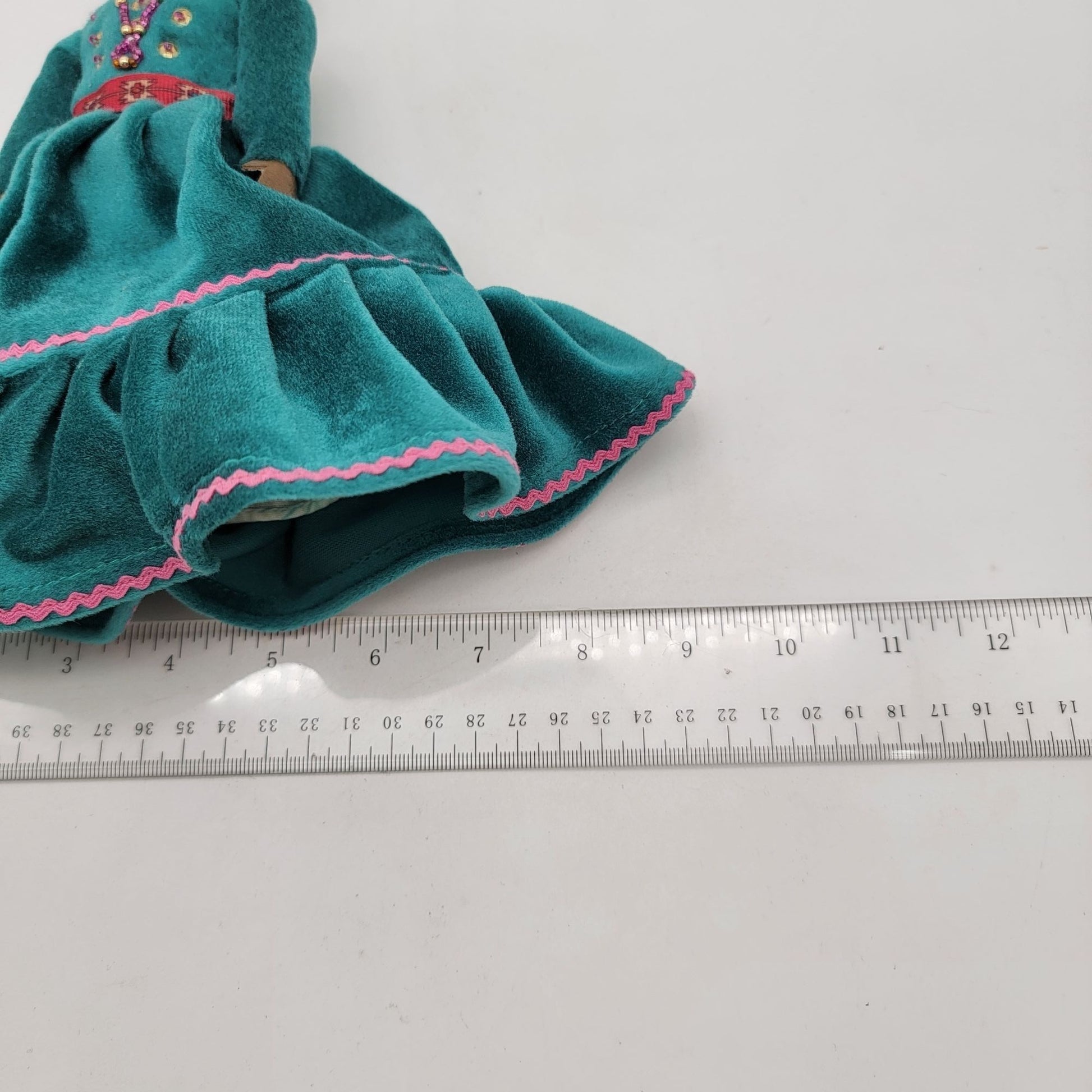 This charming vintage Navajo Dine doll features intricate handmade details, a teal velvet dress with pink trim, and vibrant beadwork, showcasing cultural craftsmanship.