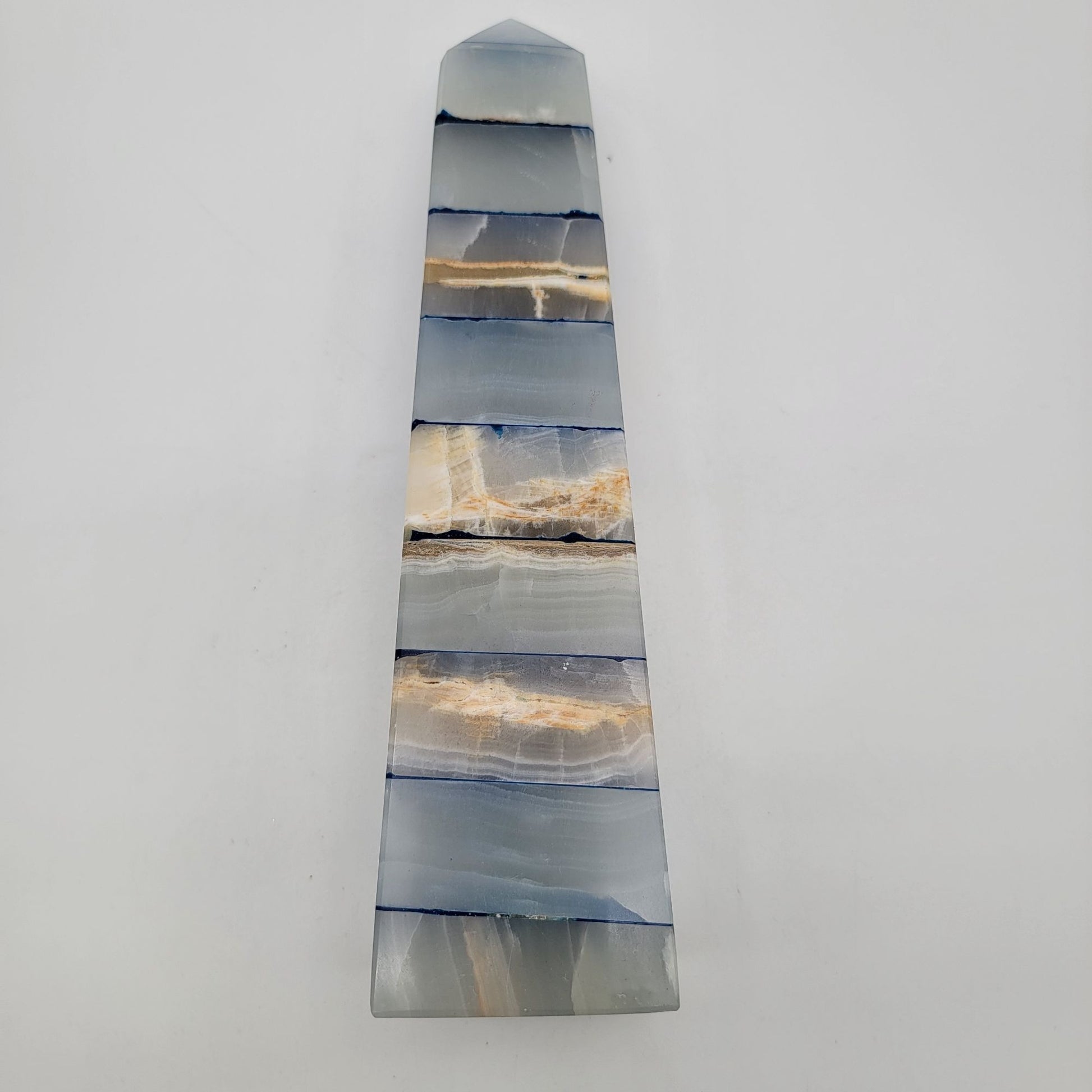This elegant obelisk tells a tale of timeless beauty. Crafted from banded onyx, its soft blue hues and golden streaks evoke tranquility and sophistication.