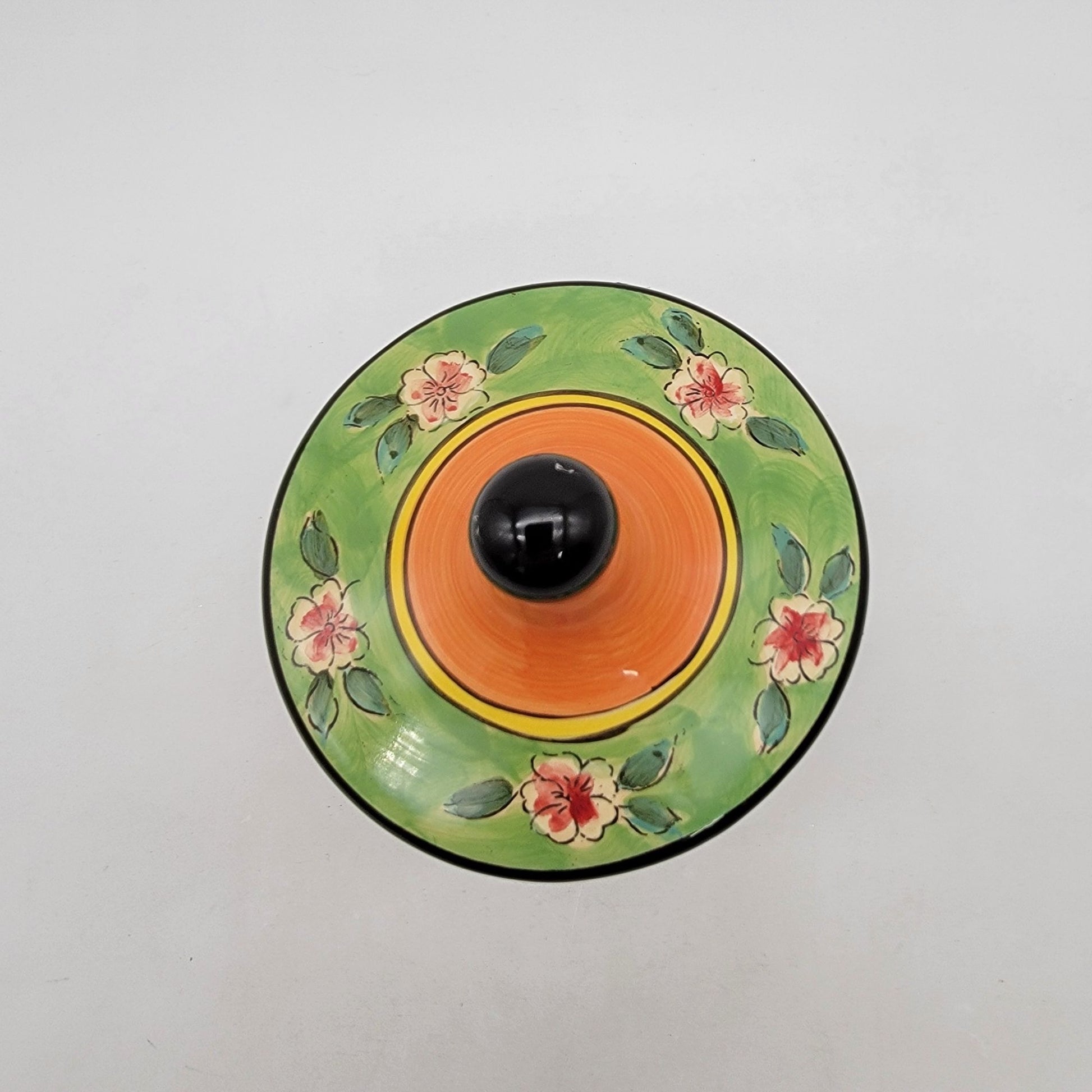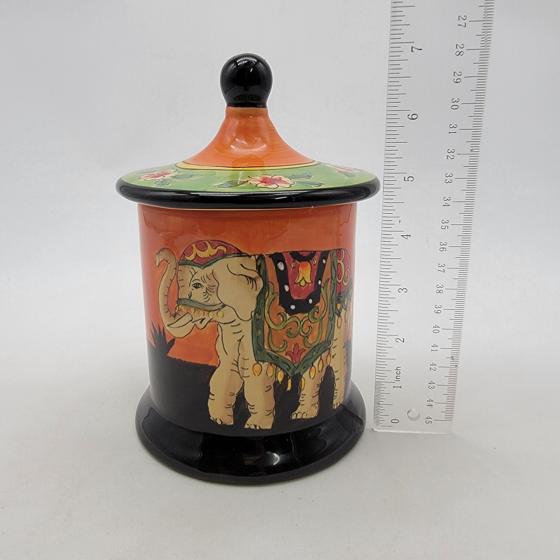This ceramic canister features a vibrant elephant design with floral accents, ideal for storing small items or as a decorative piece.