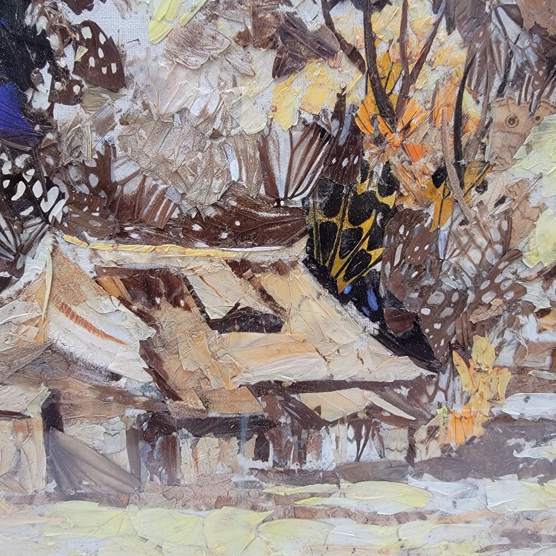 Crafted from real butterfly wings, this exquisite artwork captures a serene Asian village scene. Each intricate detail reveals a harmony of nature and artistry, inviting the viewer into a landscape where craftsmanship meets the ephemeral beauty of life. With its unique materials and delicate composition, it makes for an exceptional centerpiece.