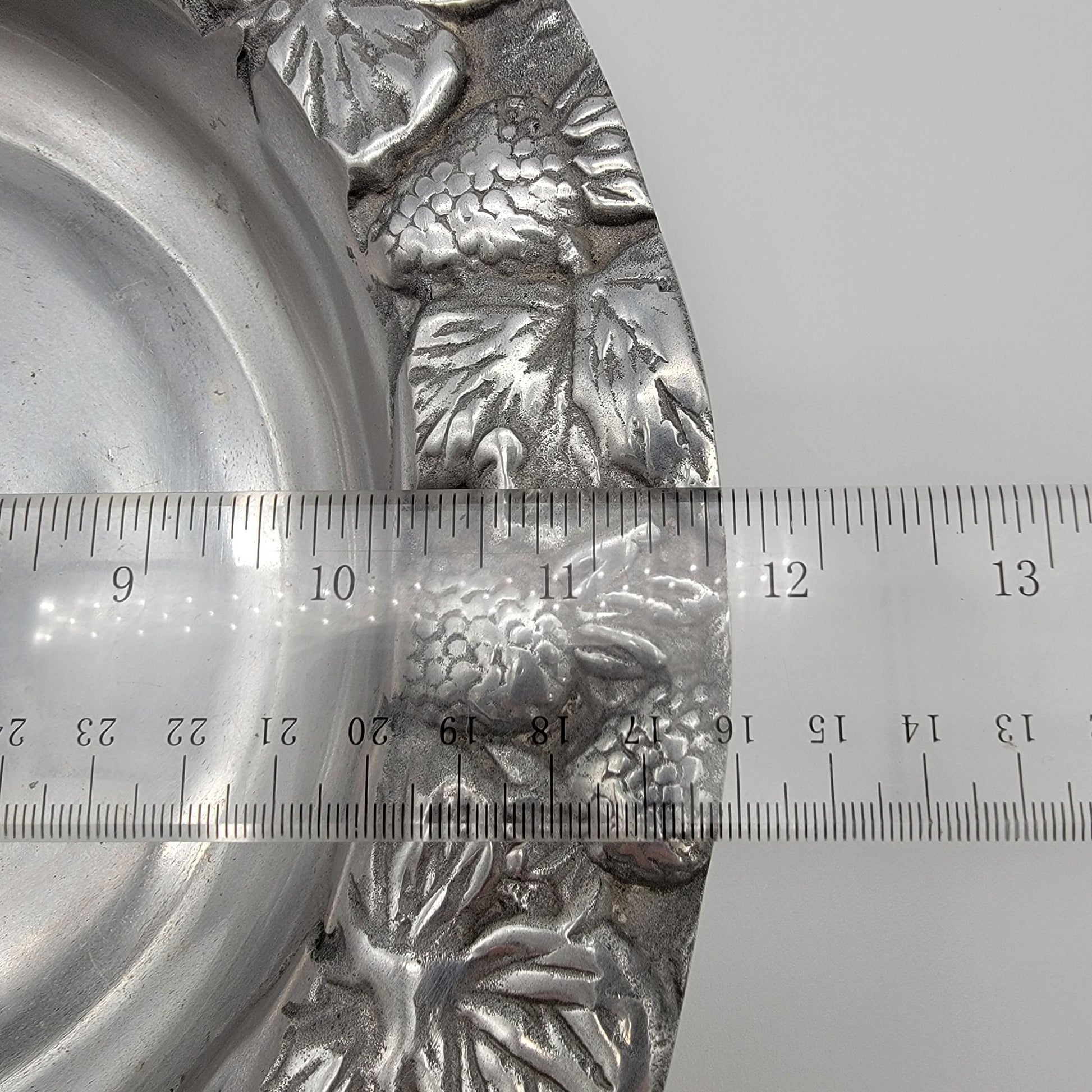 Step back in time with this vintage pewter serving bowl, adorned with an intricately embossed fruit and floral motif. Its generous 11.5-inch diameter and 2.5-inch depth make it both functional and decorative, perfect for showcasing your culinary creations or as a centerpiece. The patina and craftsmanship tell a story of timeless elegance.