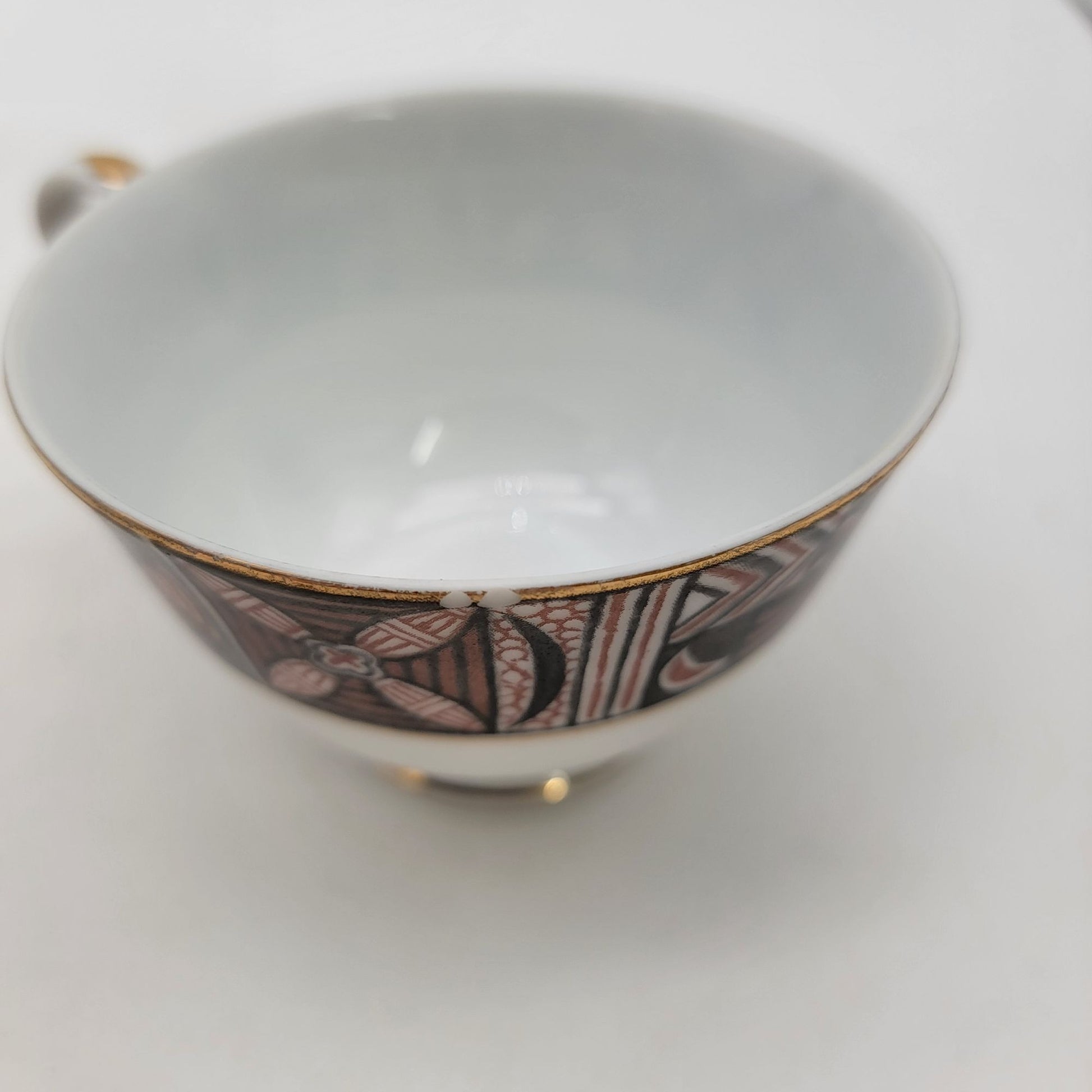 This vintage porcelain teacup and saucer set features a striking design with geometric and abstract patterns. Gold trim adds elegance.