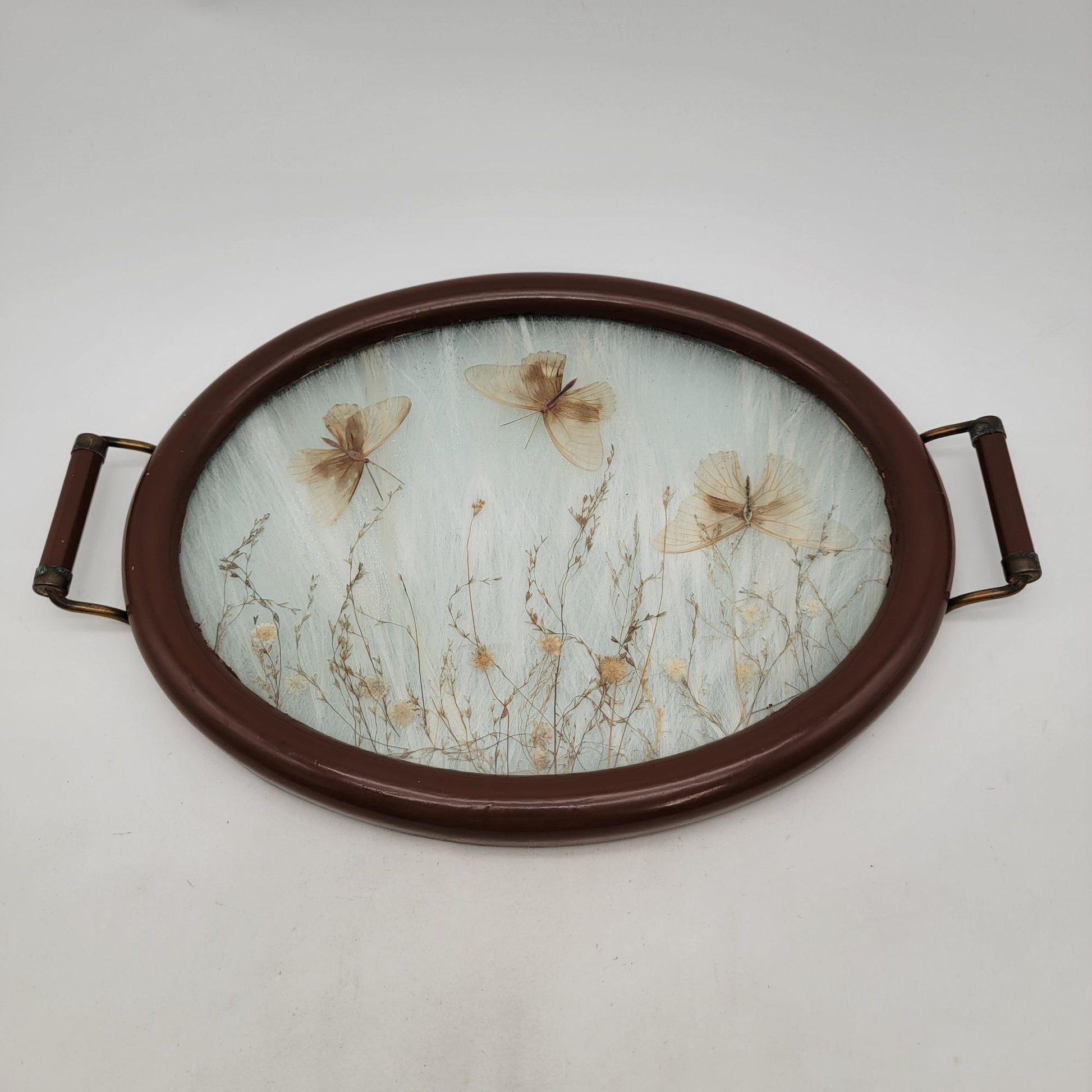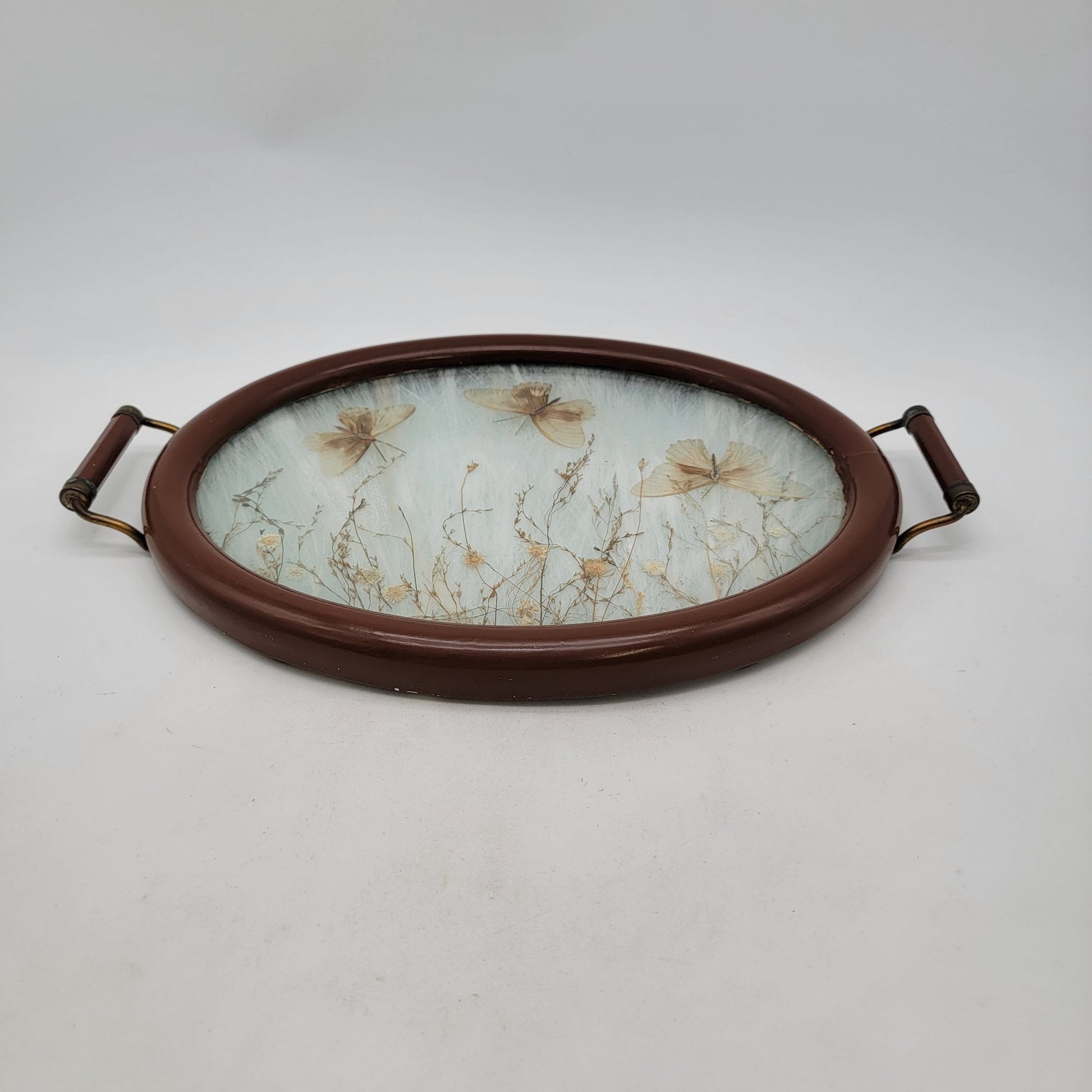 This vintage serving tray showcases delicate pressed flowers and butterflies under glass. Its painted wooden frame and brass handles exude timeless charm.