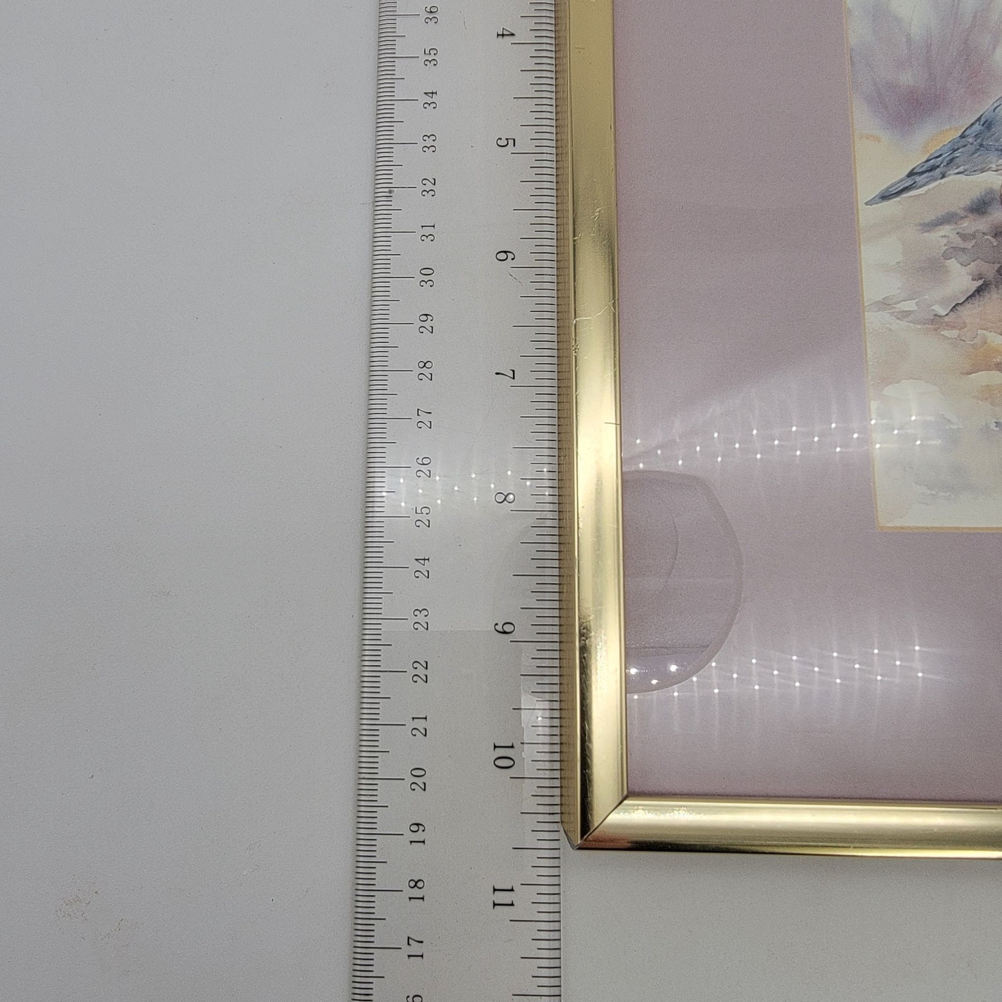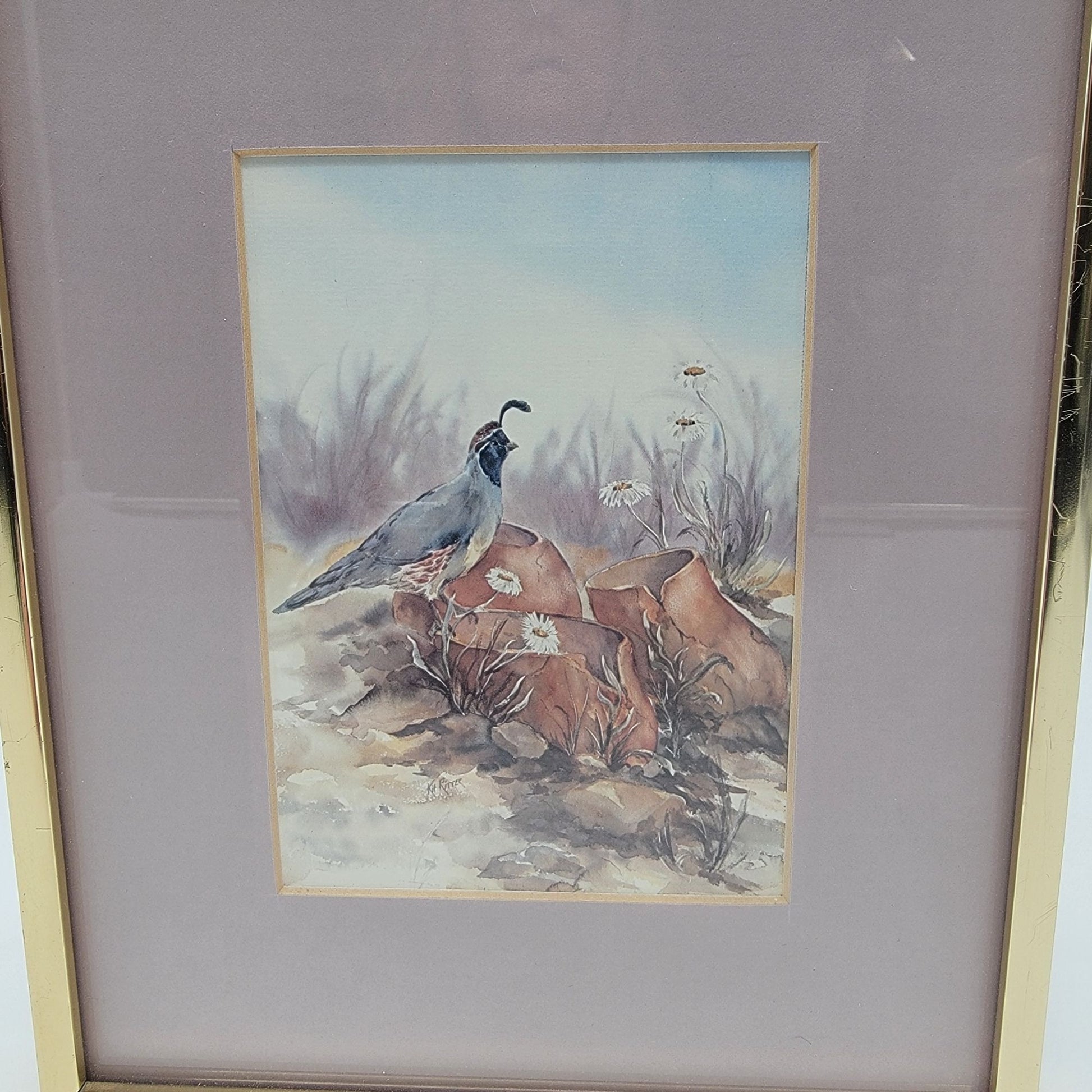 This vintage wall art features Kit Ritter's quail print, elegantly matted and encased in a gold frame. A timeless piece for art enthusiasts.