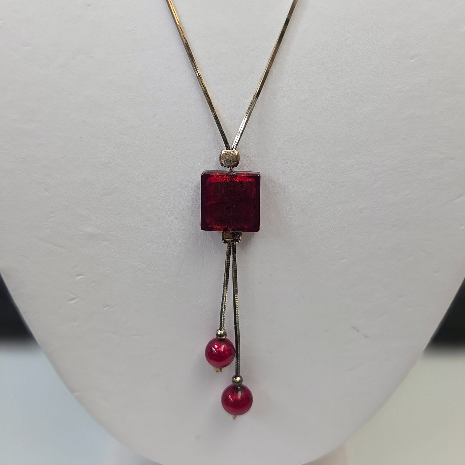 This vintage necklace tells a tale of timeless elegance with its dichroic glass pendant shimmering in red hues and faux pearl dangles. The gold-tone chain adds sophistication to its intricate design. A unique piece that captures the charm of vintage craftsmanship, perfect for cherishing or gifting.