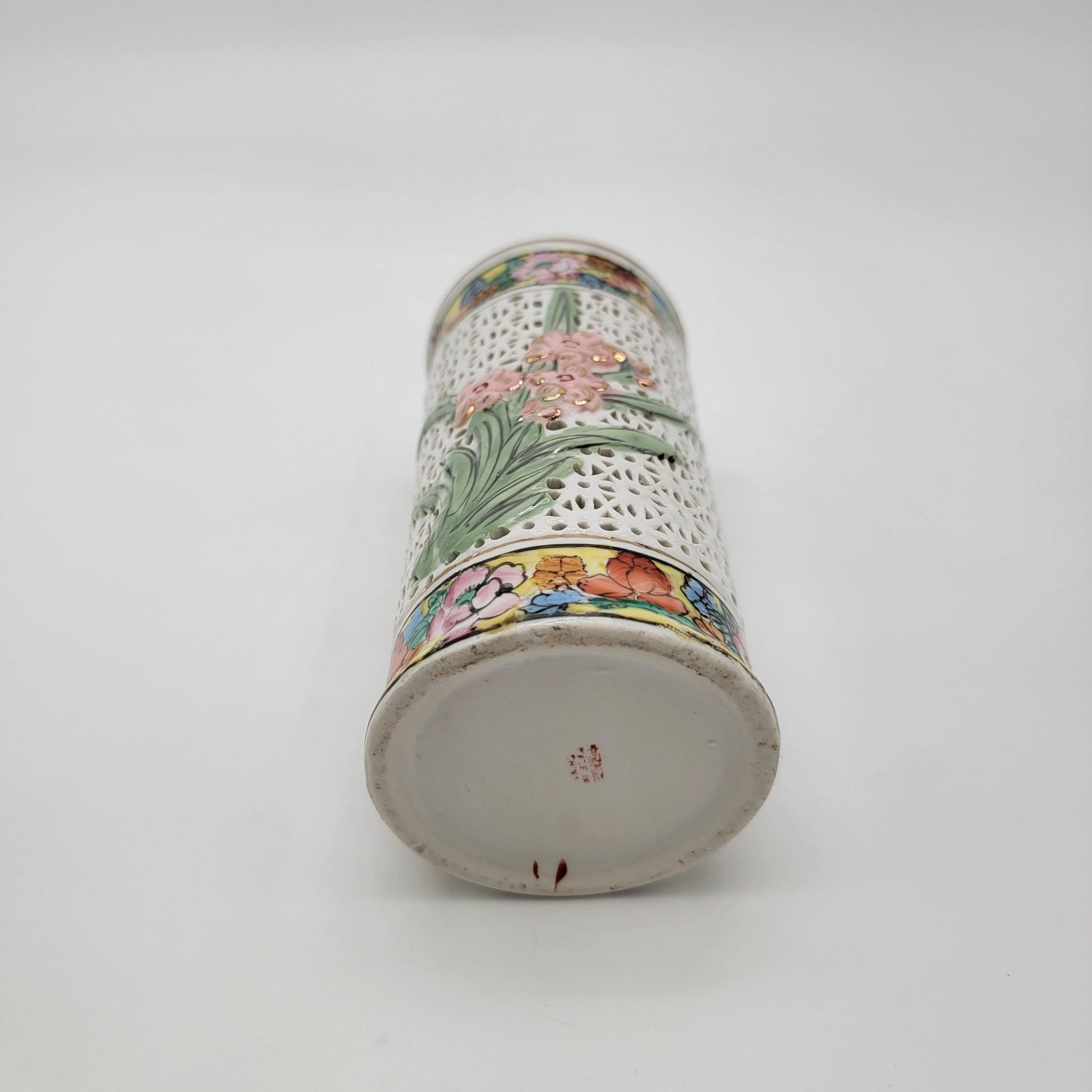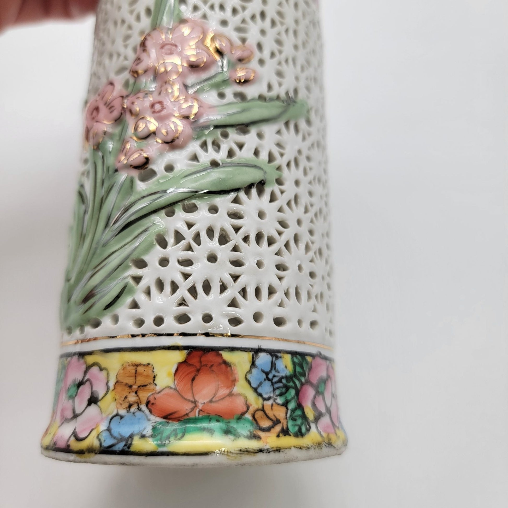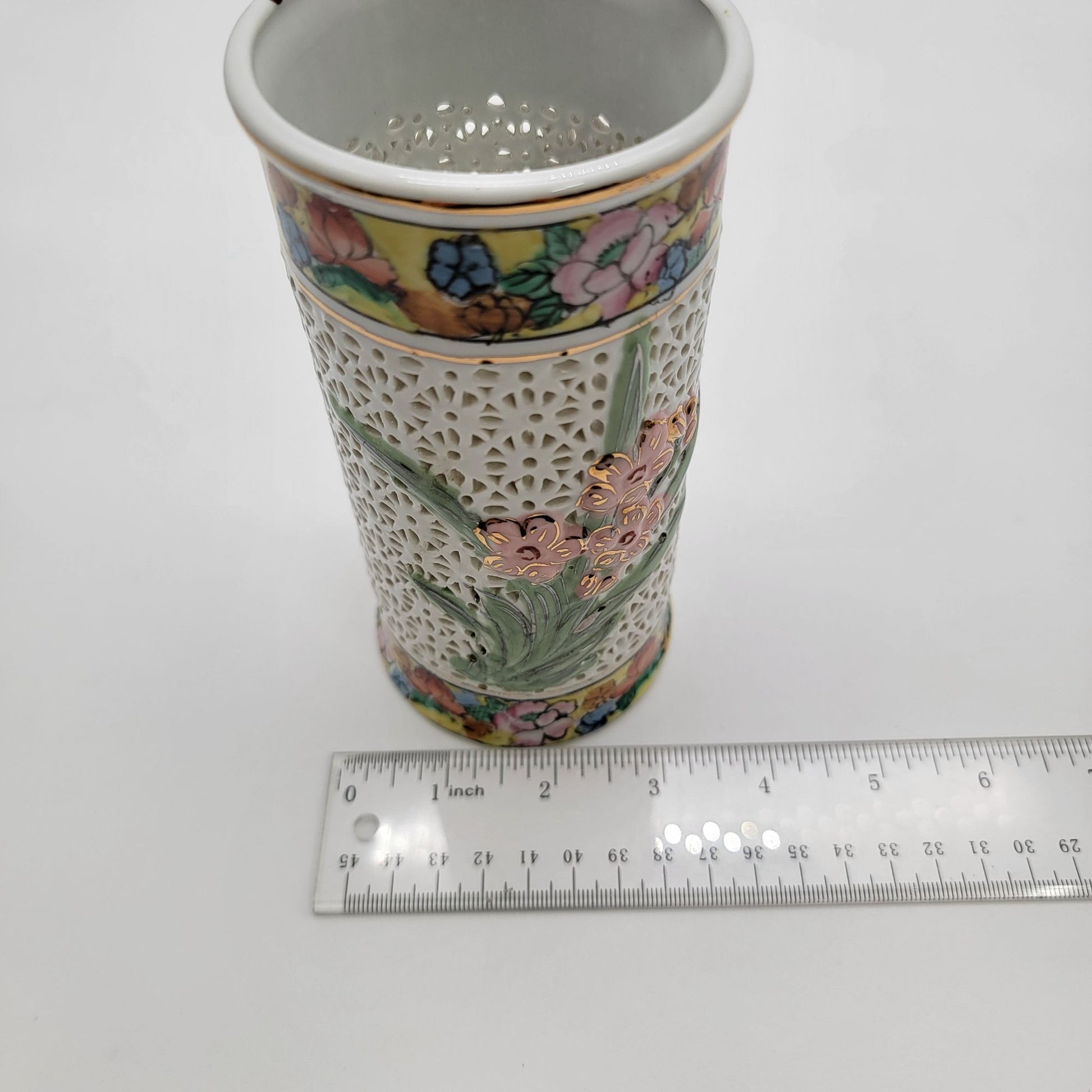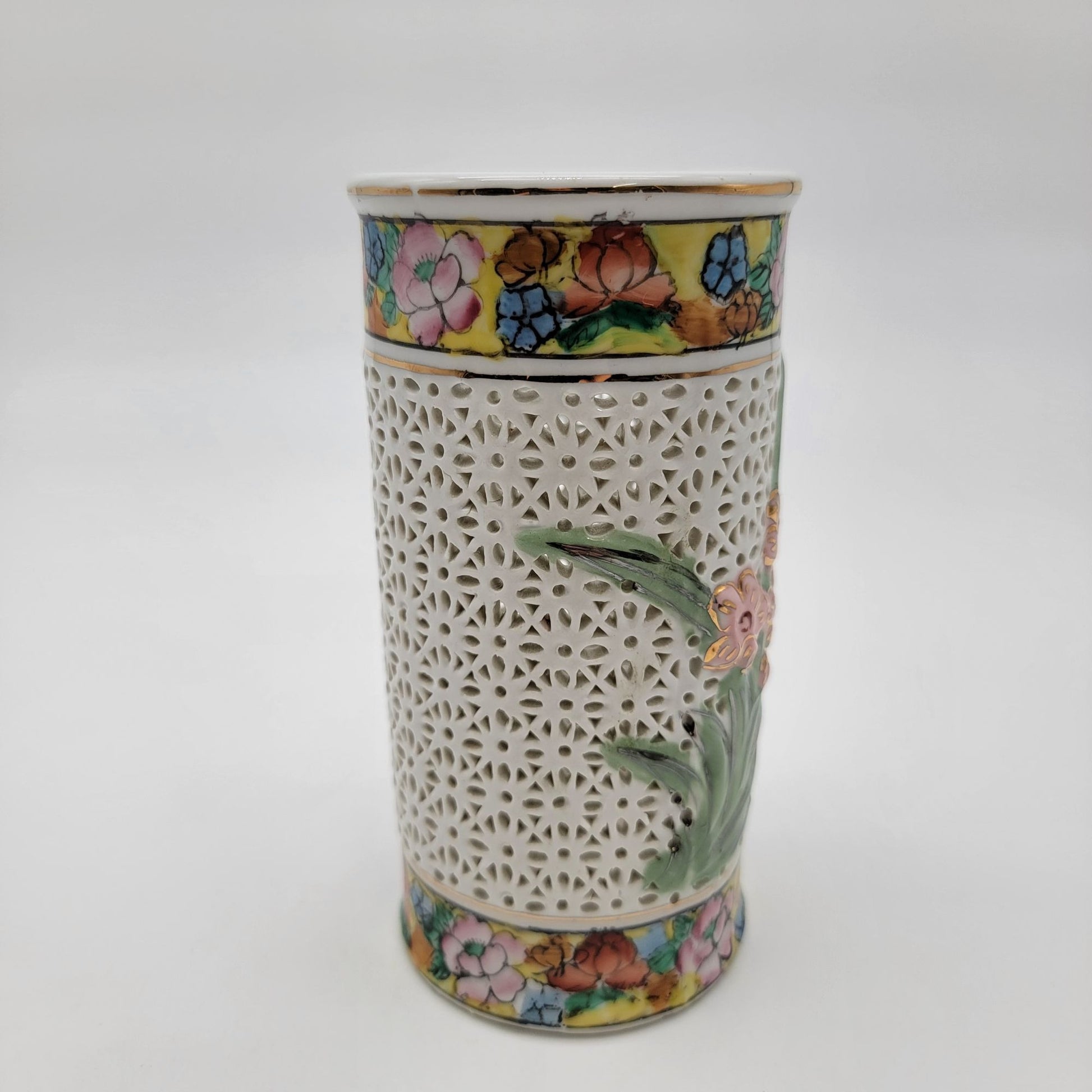 With its delicate latticework and vibrant hand-painted floral designs, this reticulated porcelain vase exudes timeless charm. The raised 3D accents add depth, while its compact size makes it perfect for showcasing small floral arrangements or as a standalone decorative piece. A collectible treasure steeped in artistry and history.