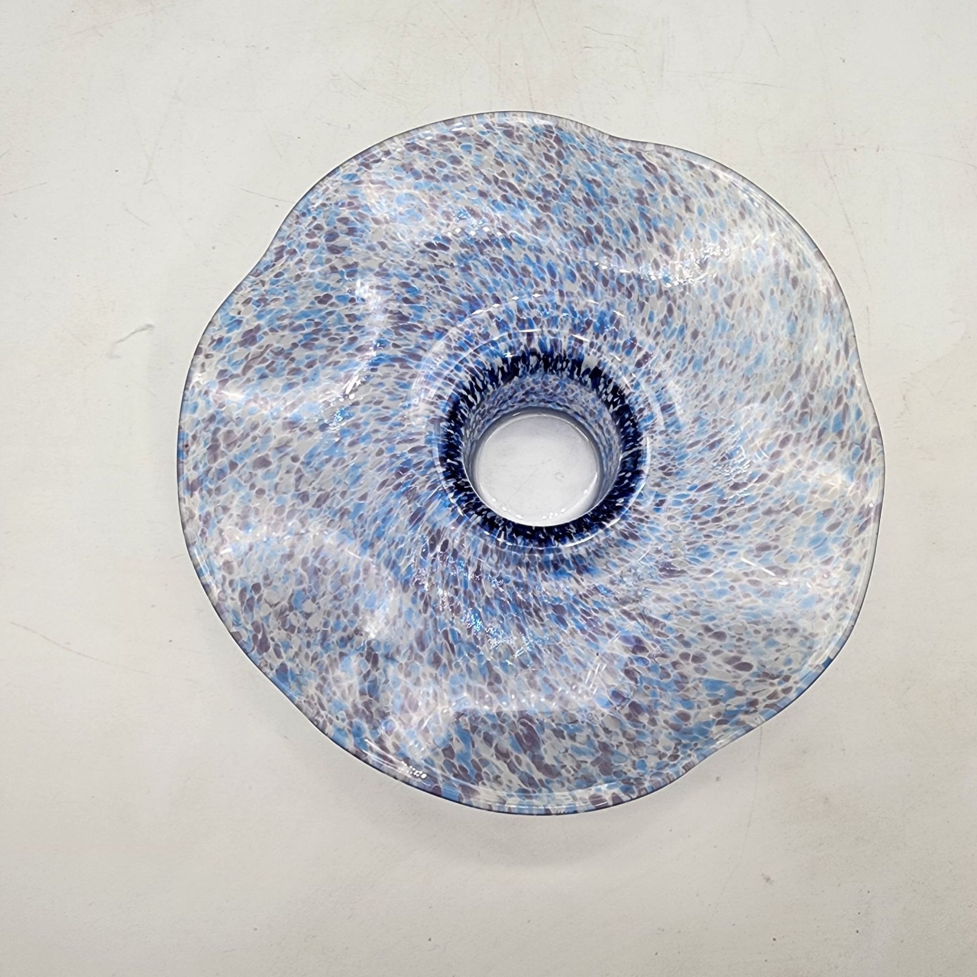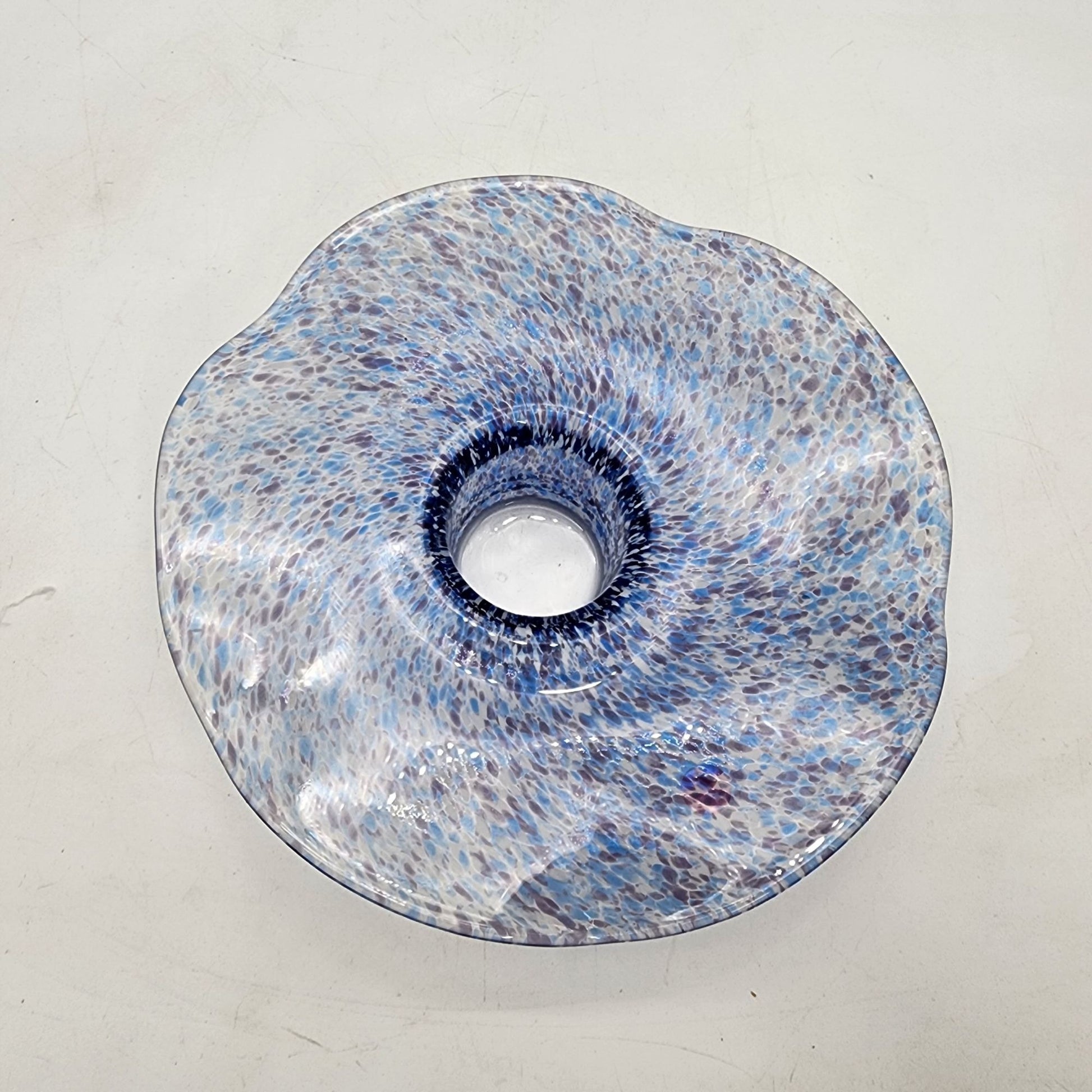 Vintage Round Wavy Blue Speckled Art Glass Candle Holder