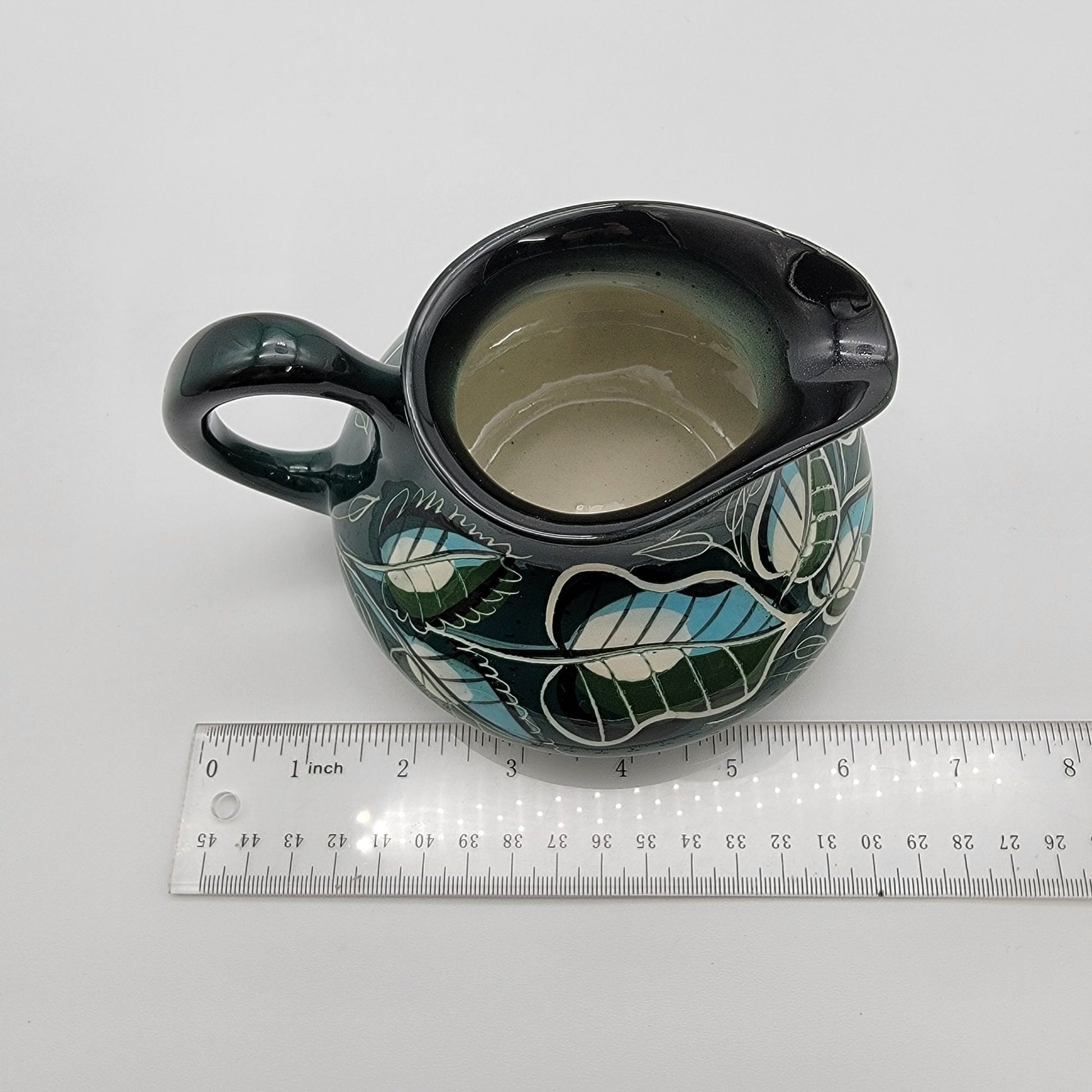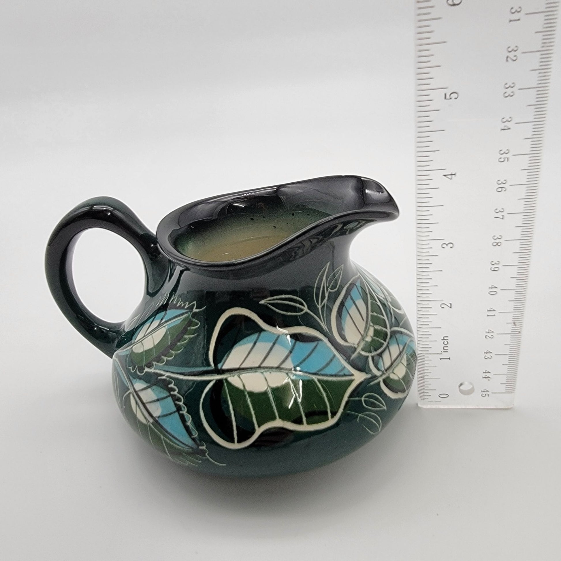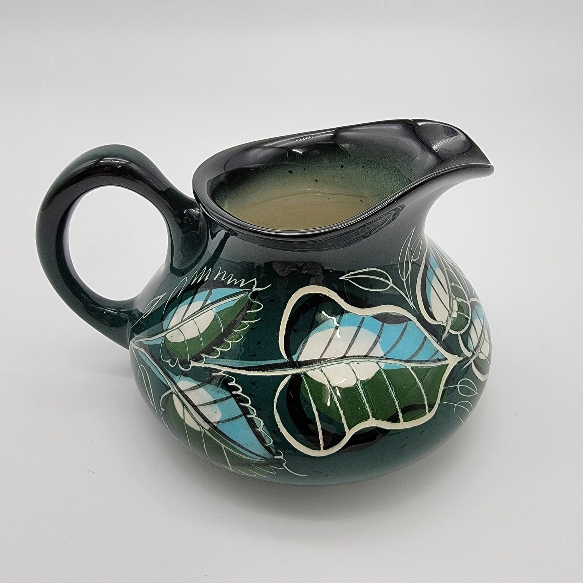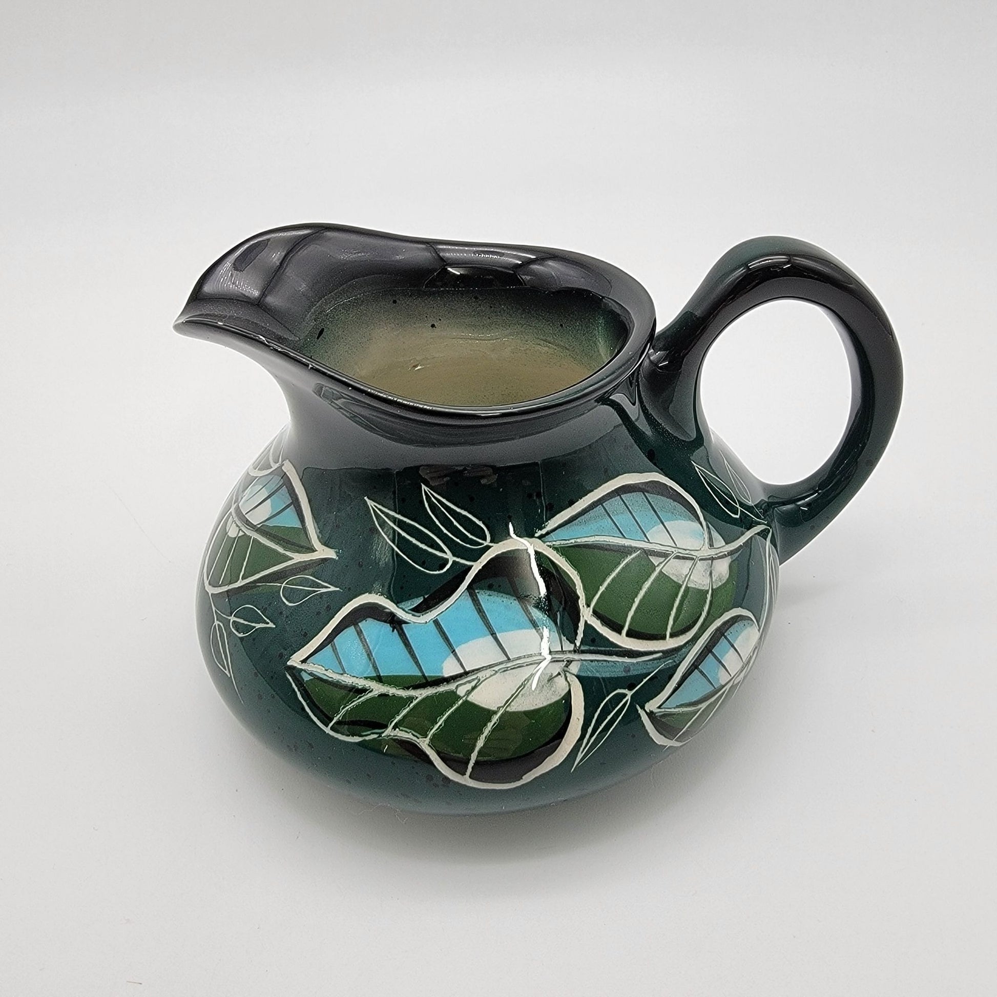 This vintage Sasha Brastoff pitcher displays exquisite craftsmanship, featuring a hand-painted leaf design in rich greens and blues. The smooth ceramic finish and signed base make it a collectible treasure for art enthusiasts and mid-century decor lovers alike. Perfect as a unique display or functional piece.
