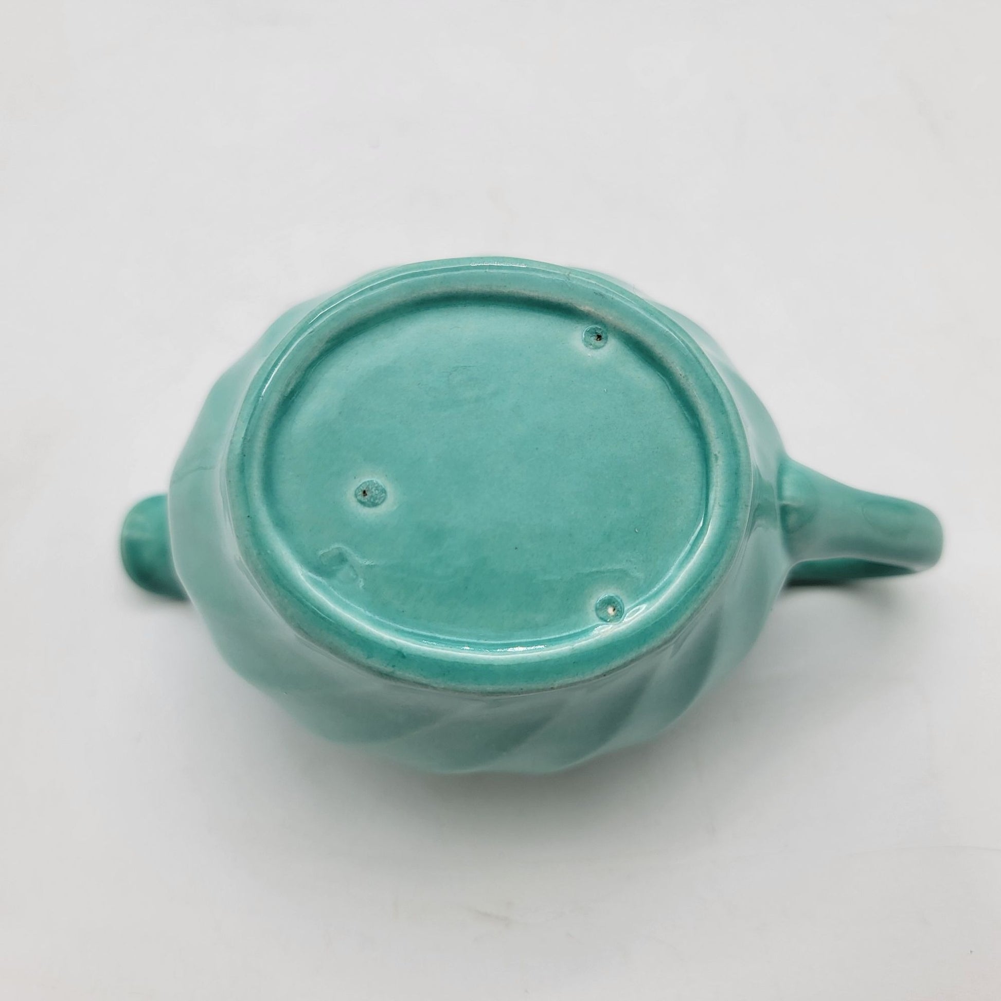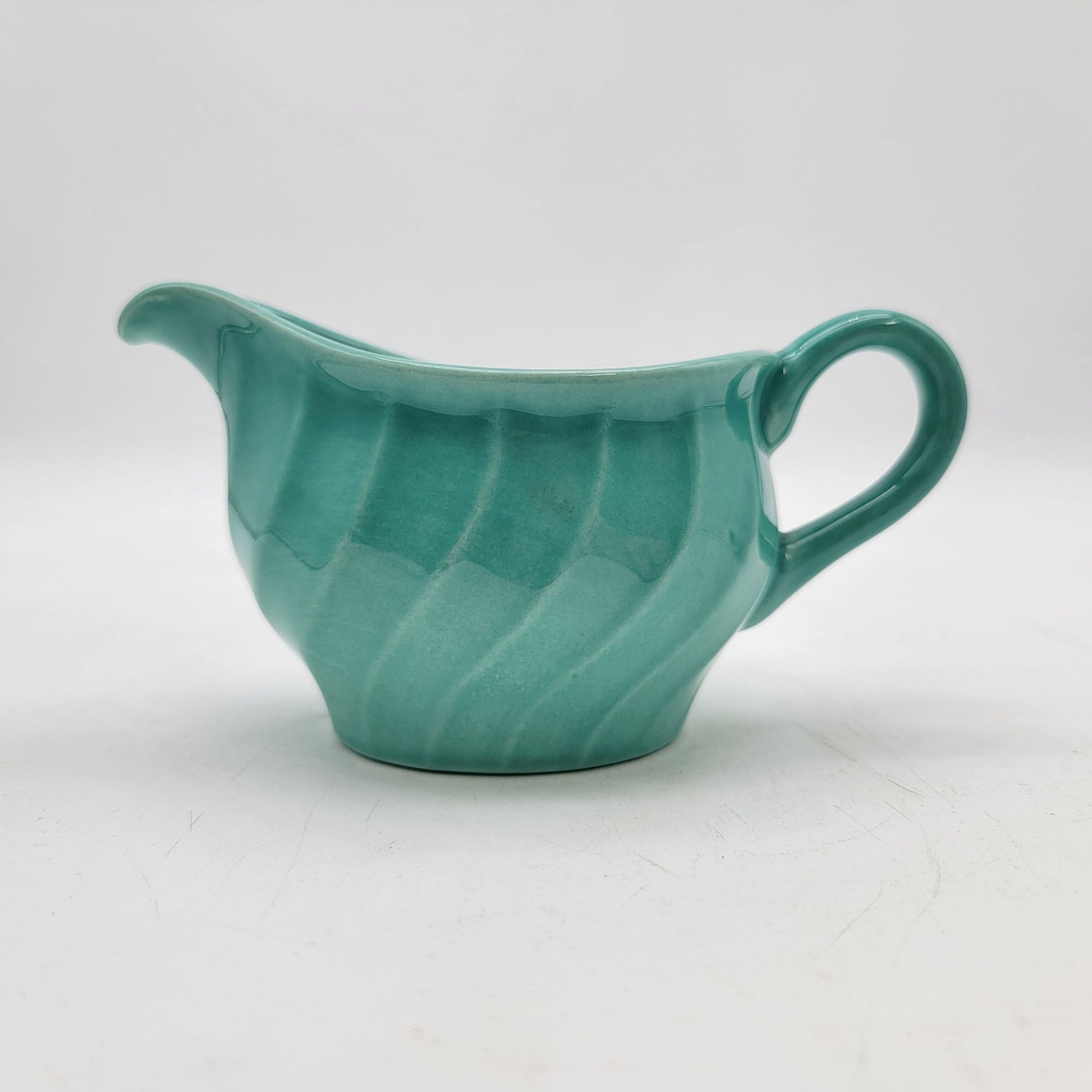 This vintage pottery creamer exudes timeless charm with its elegant turquoise blue green glaze and swirl design. Perfect for adding a touch of classic sophistication to your dining table or collection. The sturdy handle and functional spout enhance its usability while maintaining its antique aesthetic. Matches the Franciscan Coronado pattern
