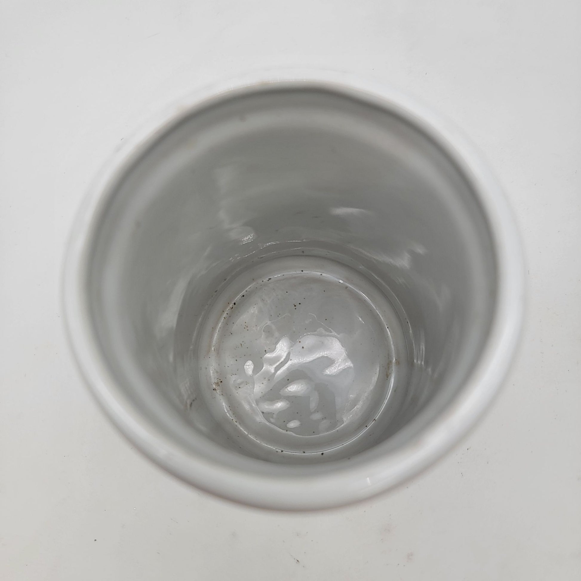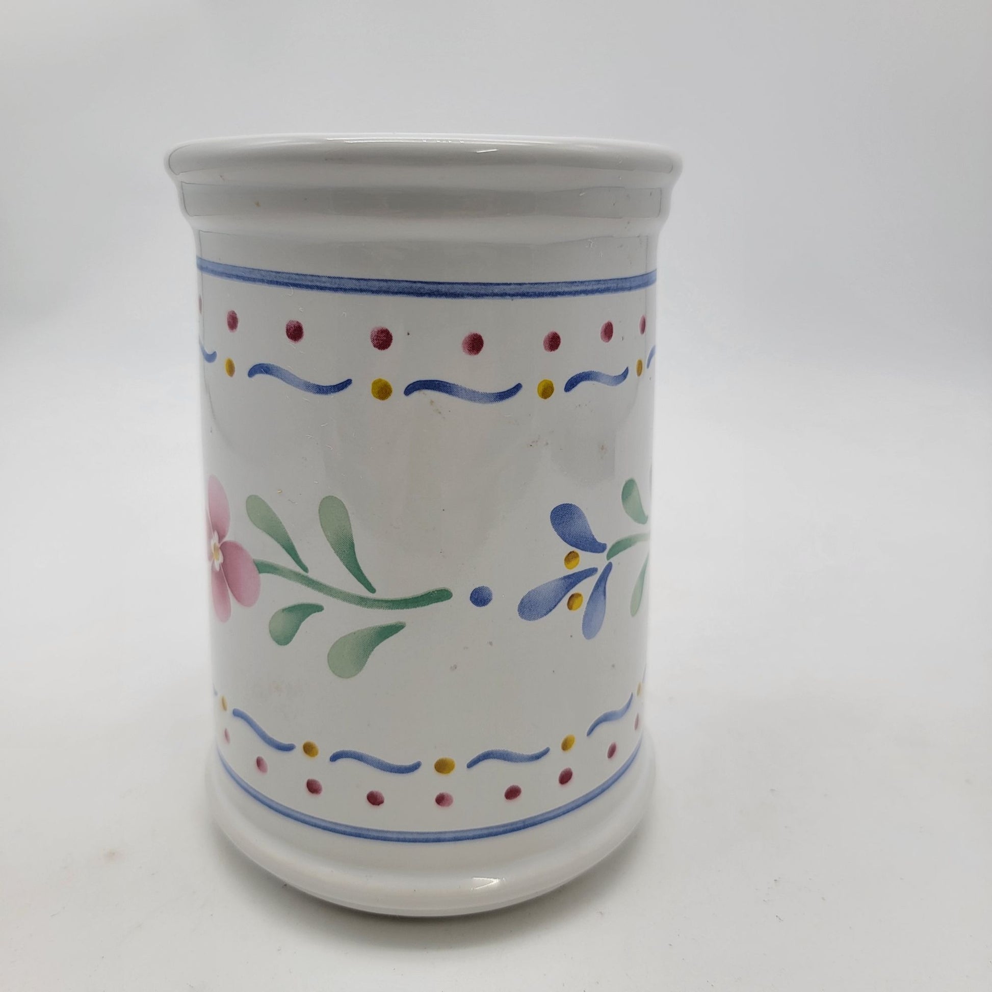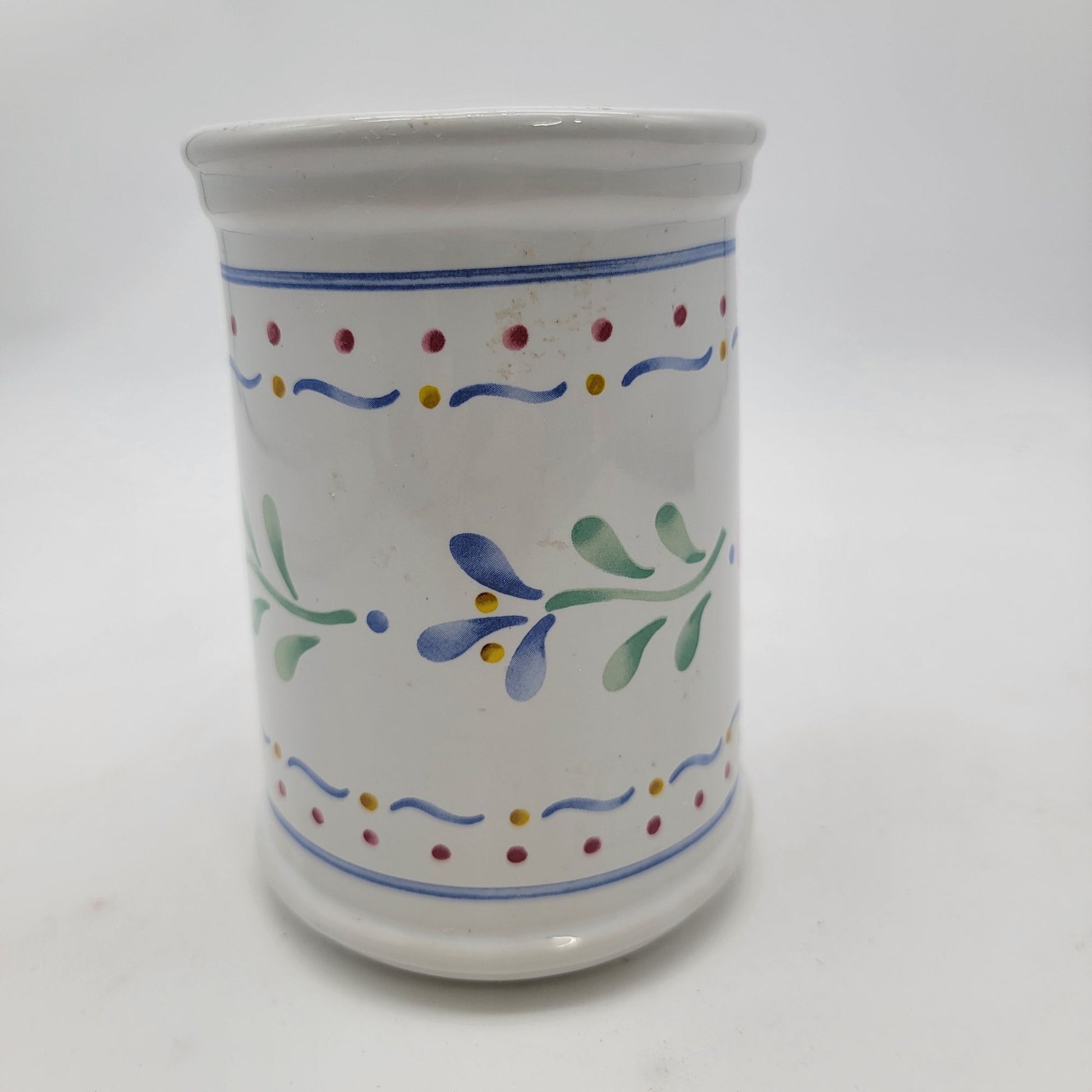 This vintage hand-painted ceramic utensil holder exudes a timeless charm, with its delicate floral design and elegant craftsmanship. It's an ideal addition to any kitchen, offering both functionality and aesthetic appeal. The piece captures the essence of bygone eras, making it a cherished item for those who appreciate classic designs.