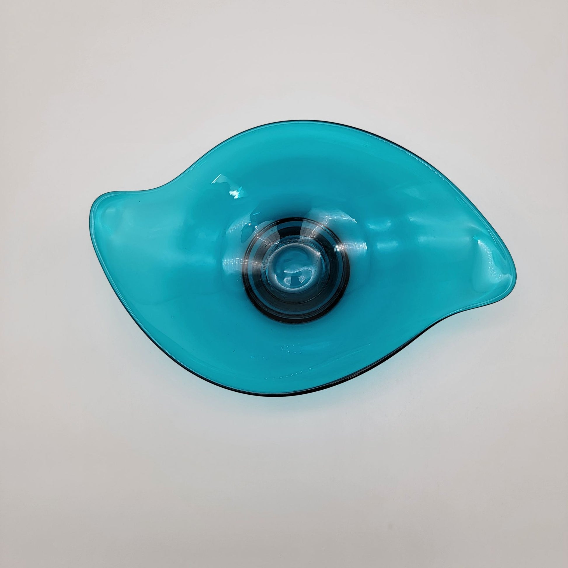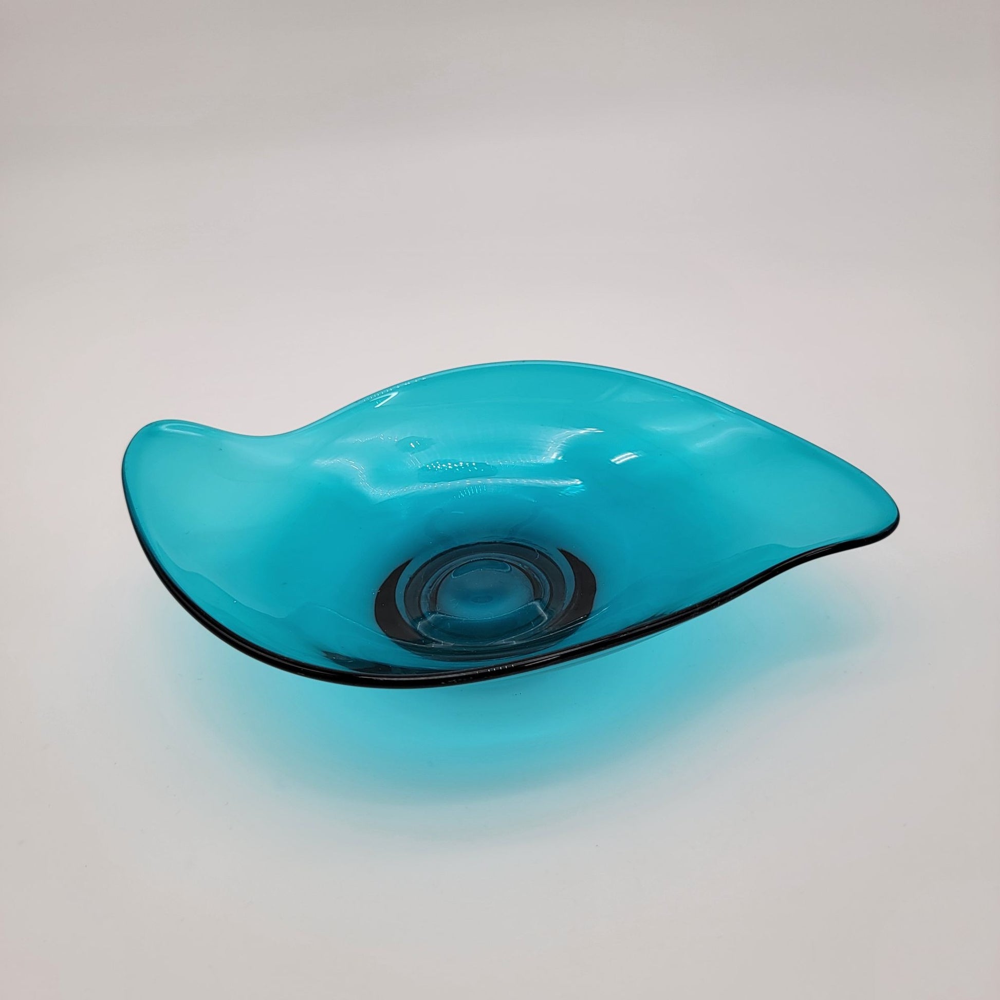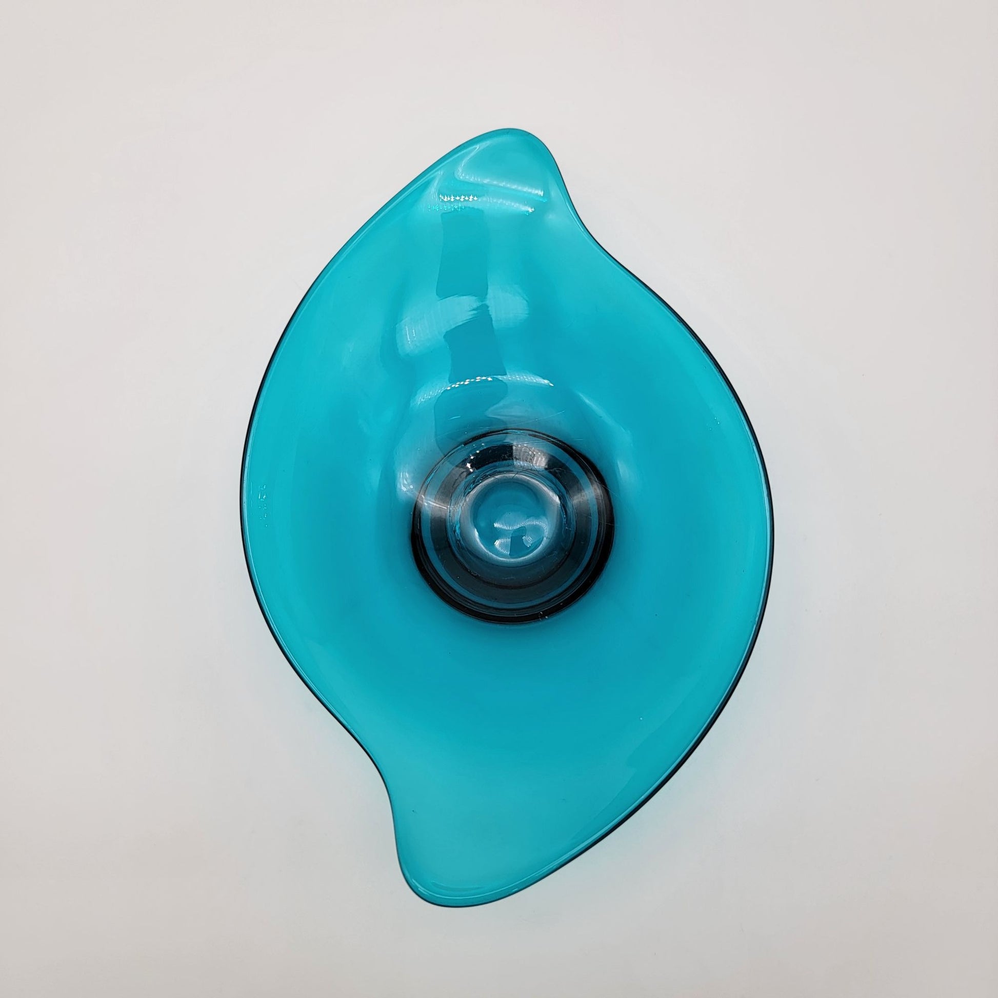 A captivating mid-century modern Viking Epic dish in the vibrant Bluenique color. Its atomic-inspired, freeform design evokes retro charm, making it a striking decorative piece. Crafted with precision, this dish showcases smooth curves, perfect for enhancing your space with a timeless turquoise accent. A true collectible from the golden age of design.