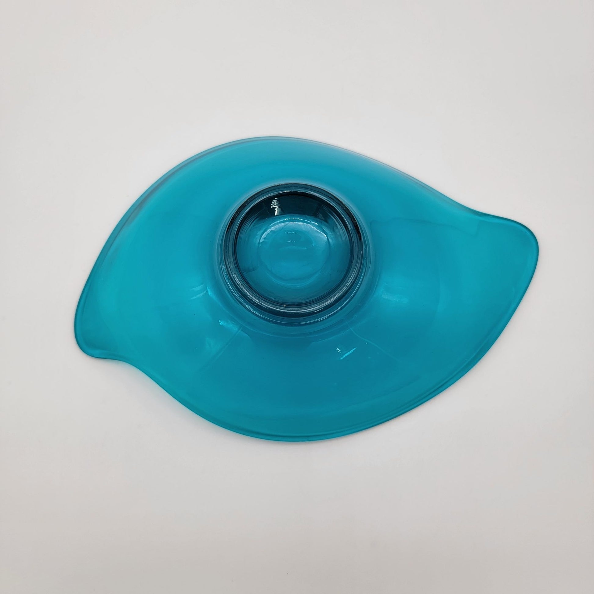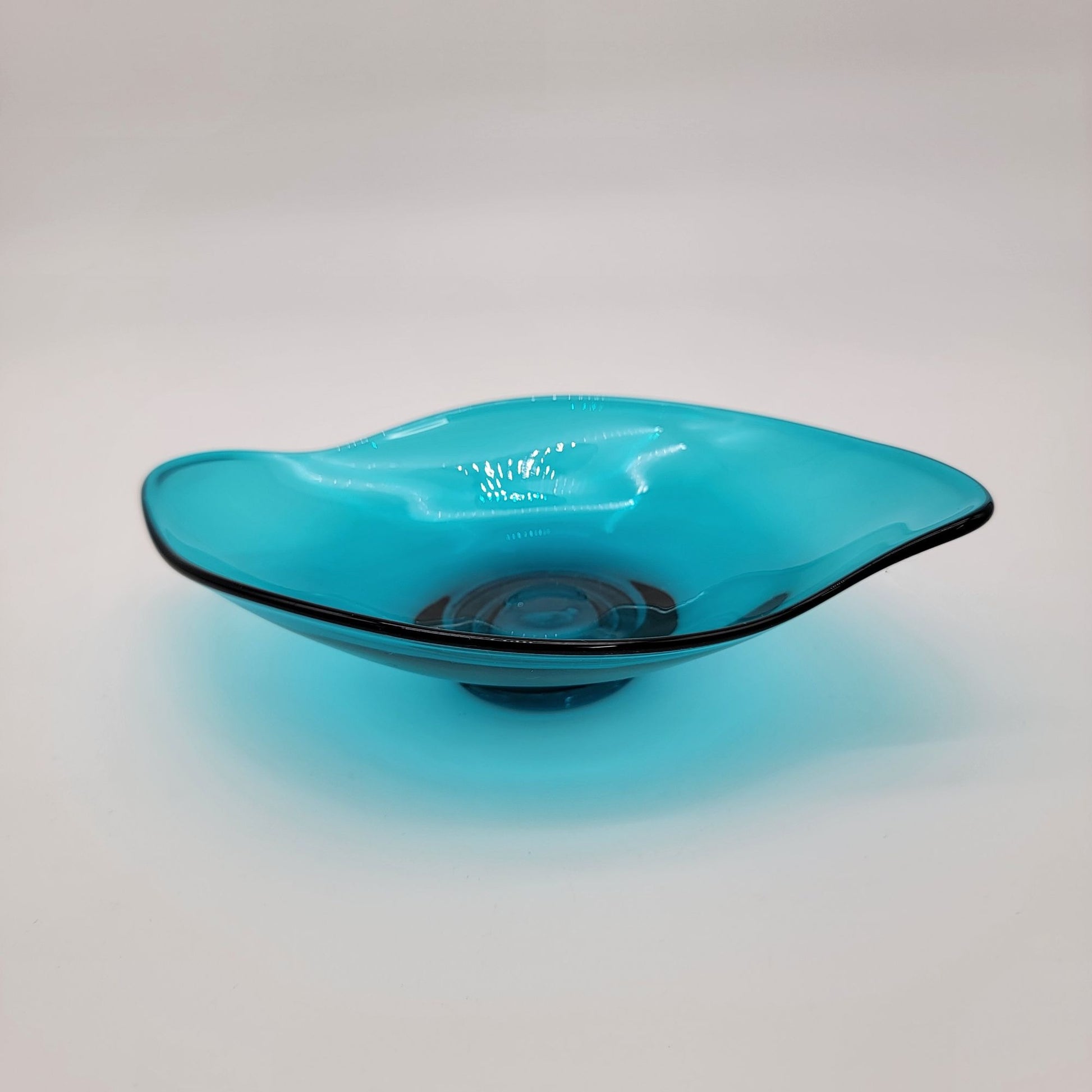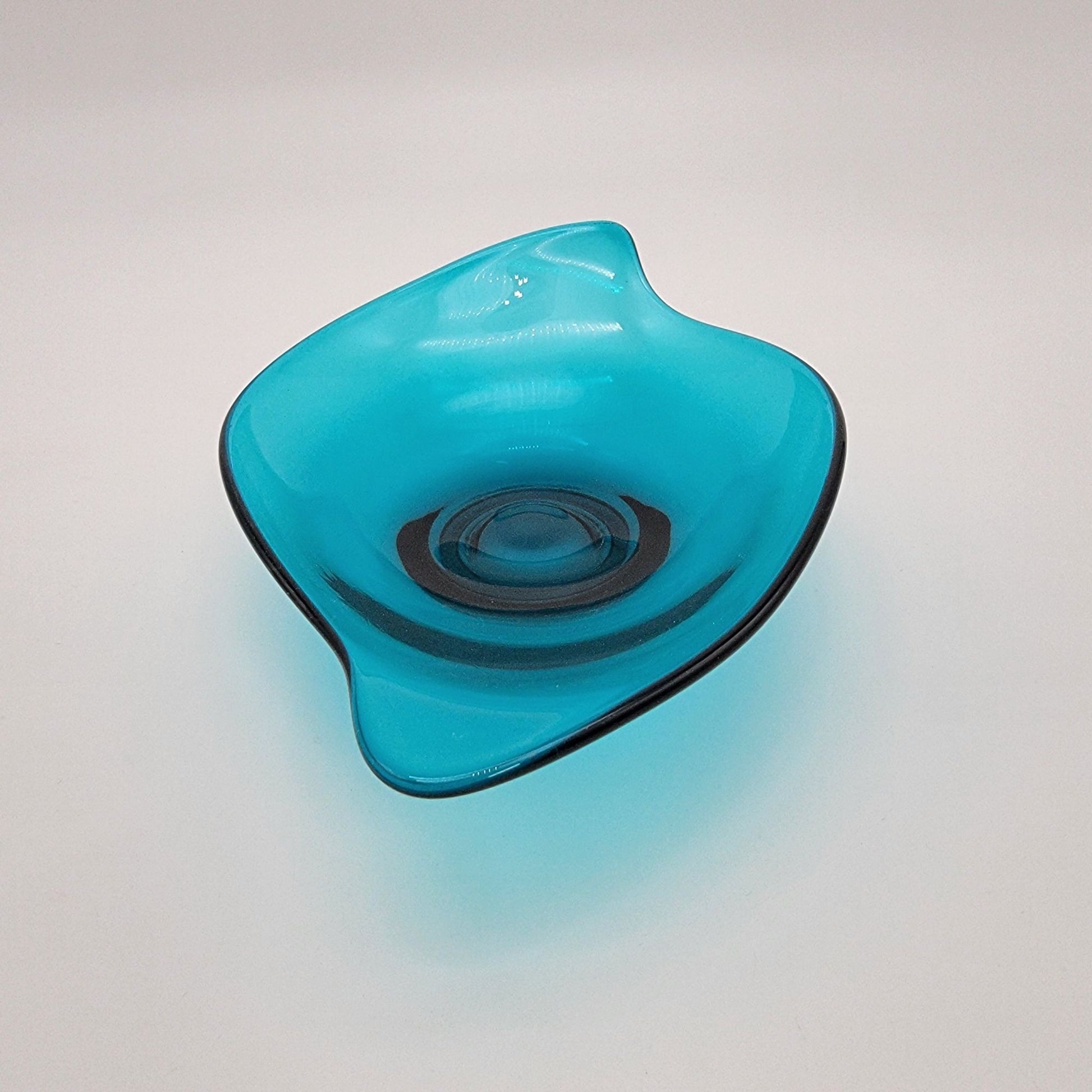 A captivating mid-century modern Viking Epic dish in the vibrant Bluenique color. Its atomic-inspired, freeform design evokes retro charm, making it a striking decorative piece. Crafted with precision, this dish showcases smooth curves, perfect for enhancing your space with a timeless turquoise accent. A true collectible from the golden age of design.