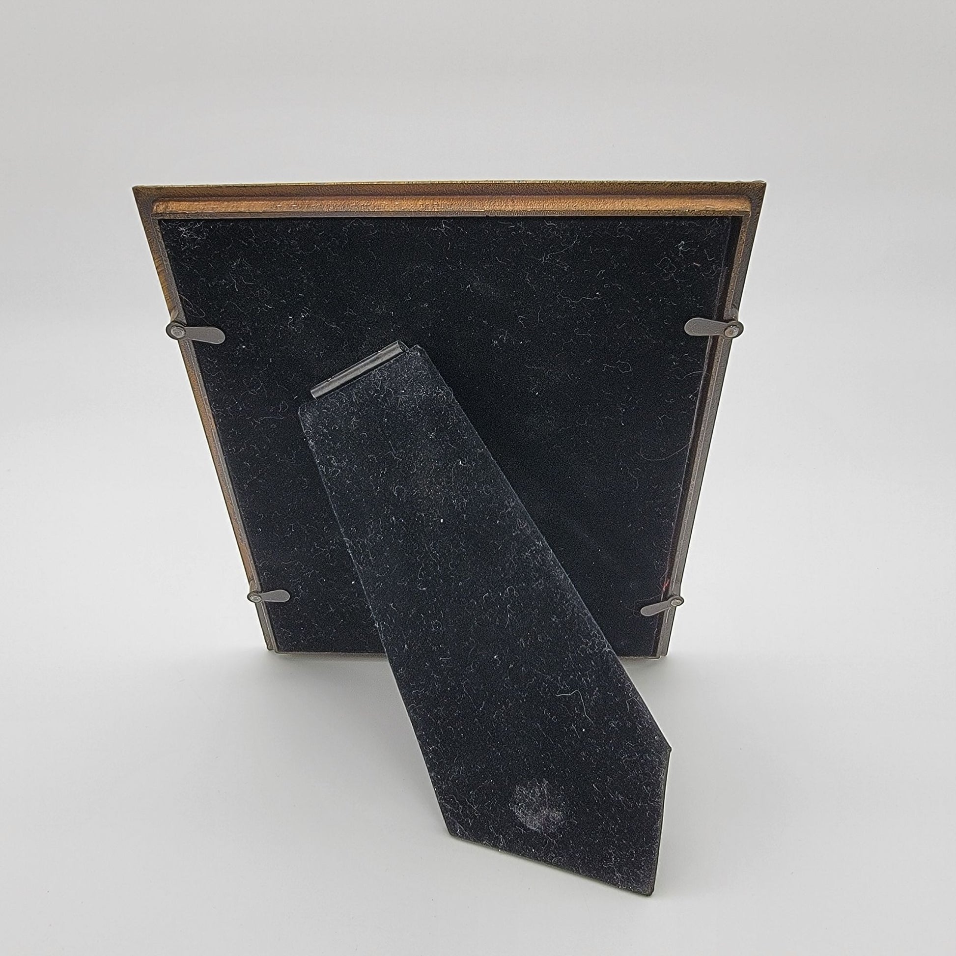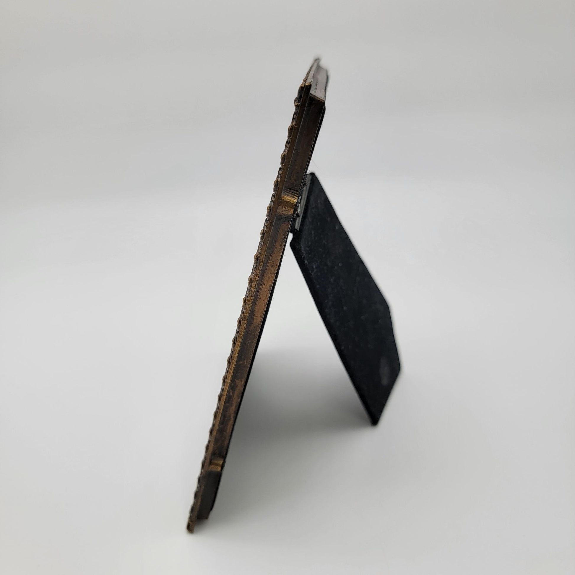 Crafted with intricate filigree metalwork, this vintage frame showcases timeless elegance. Ideal for preserving cherished memories, it features a luxurious velvet-backed stand.