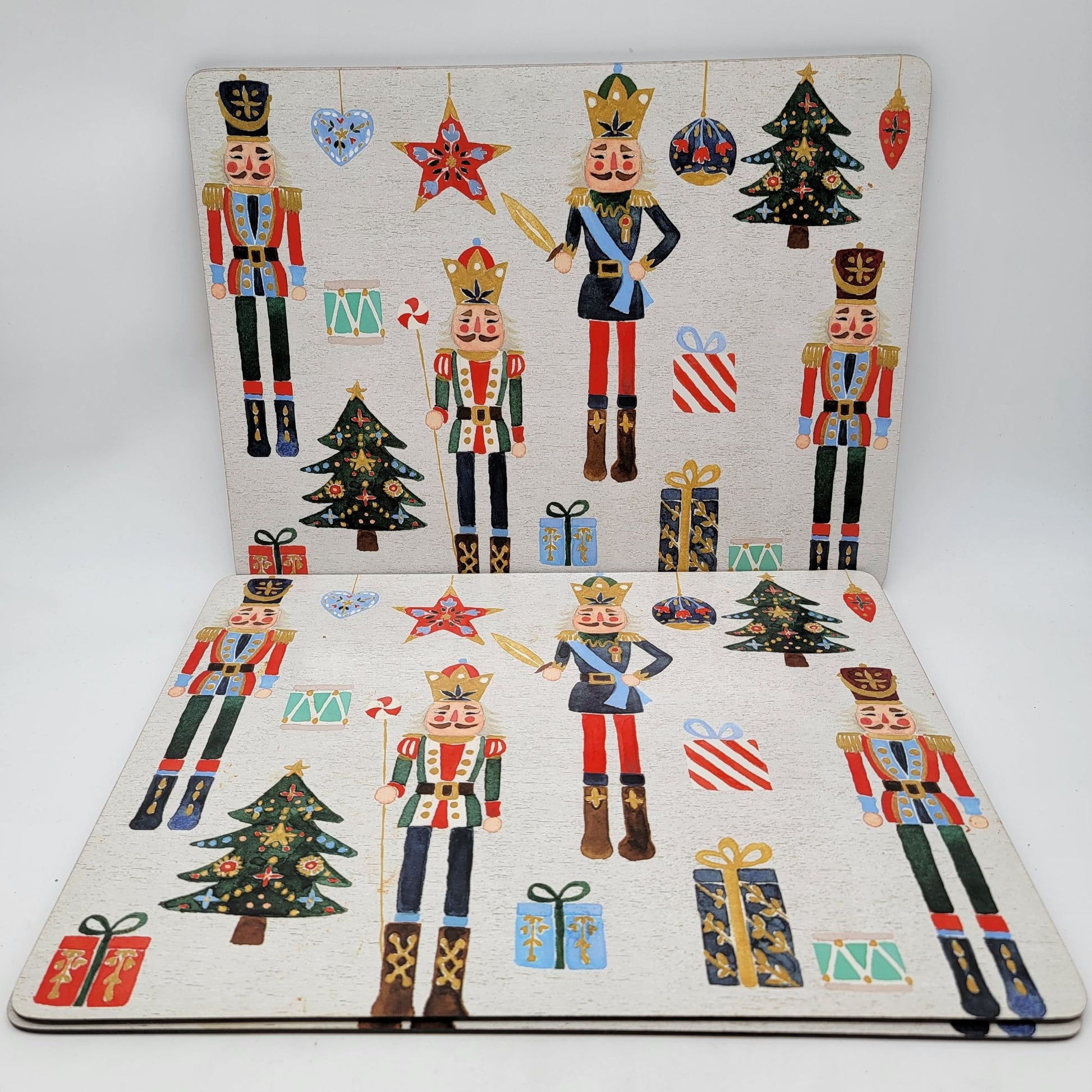 These festive placemats feature a charming nutcracker design, ideal for holiday dining. With a cork backing, they protect your table while adding a seasonal touch.