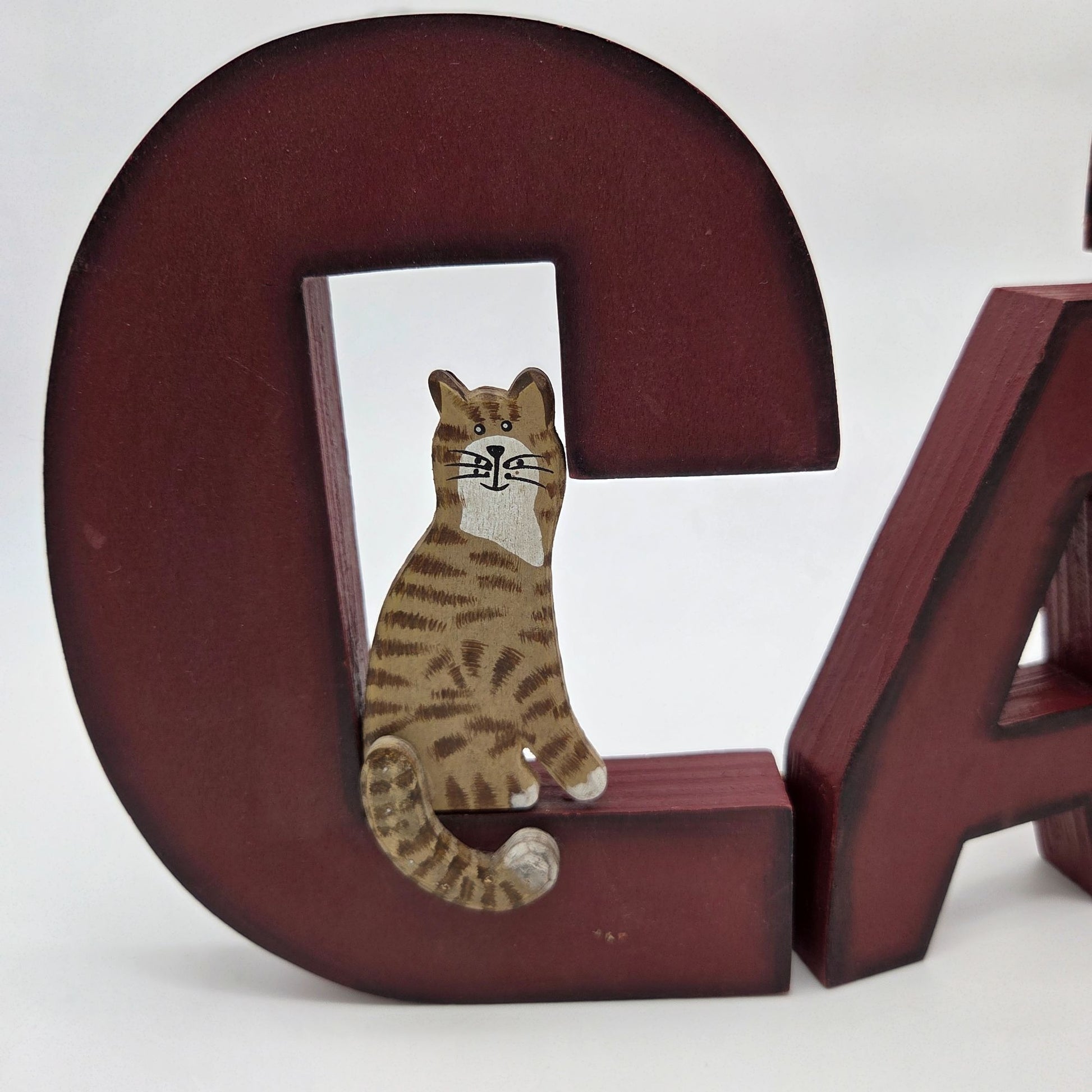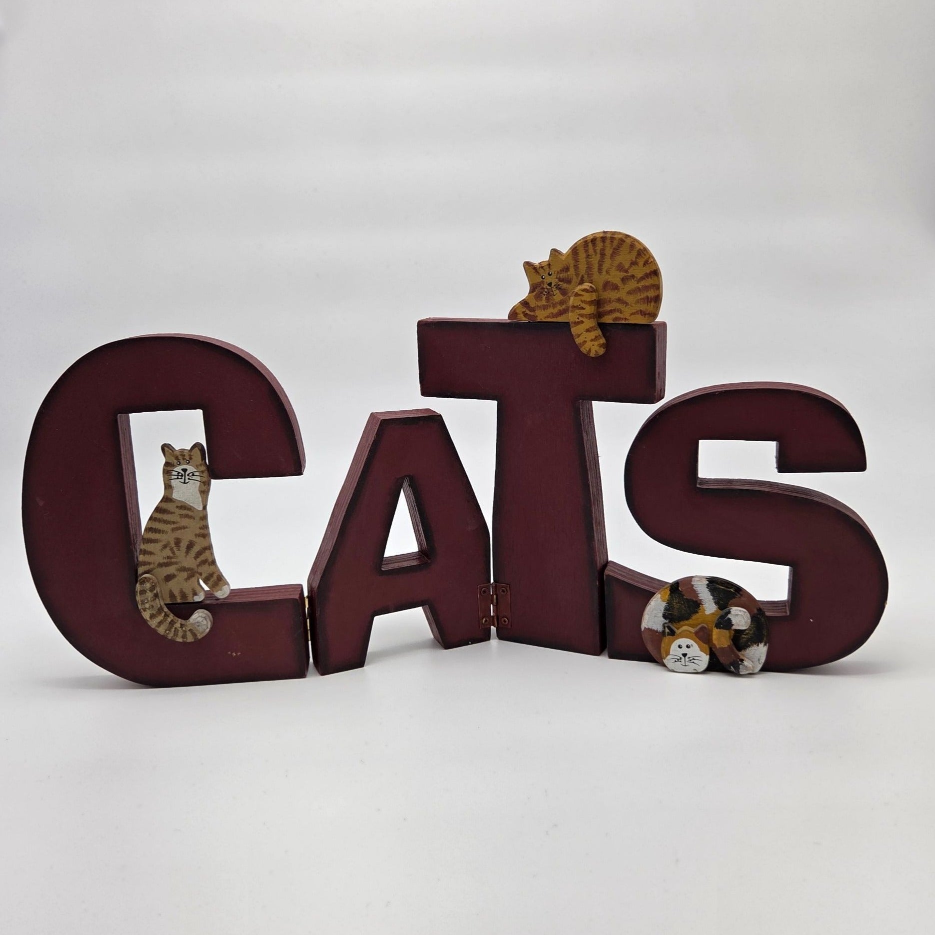 A charming wooden "CATS" display with hinged letters featuring hand-painted cat figurines. Perfect for collectors or adding a vintage touch to decor.