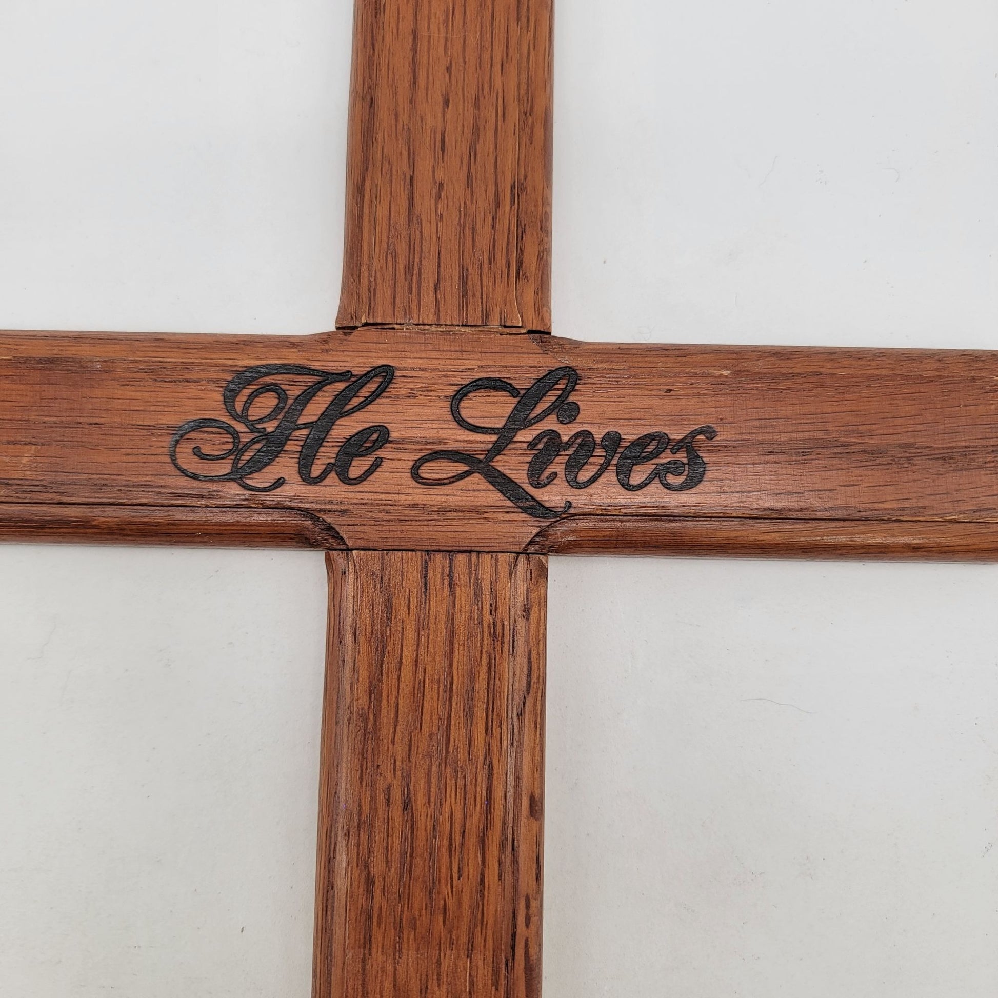 Crafted from wood, this wall cross features a laser-etched "He Lives" design. A meaningful piece for religious observance or home decoration.
