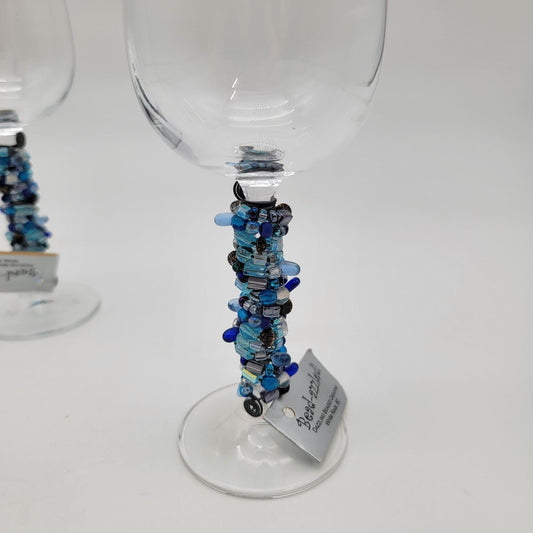 Pair Of Bead-Azzled Blue Beaded Stem Wine Glasses